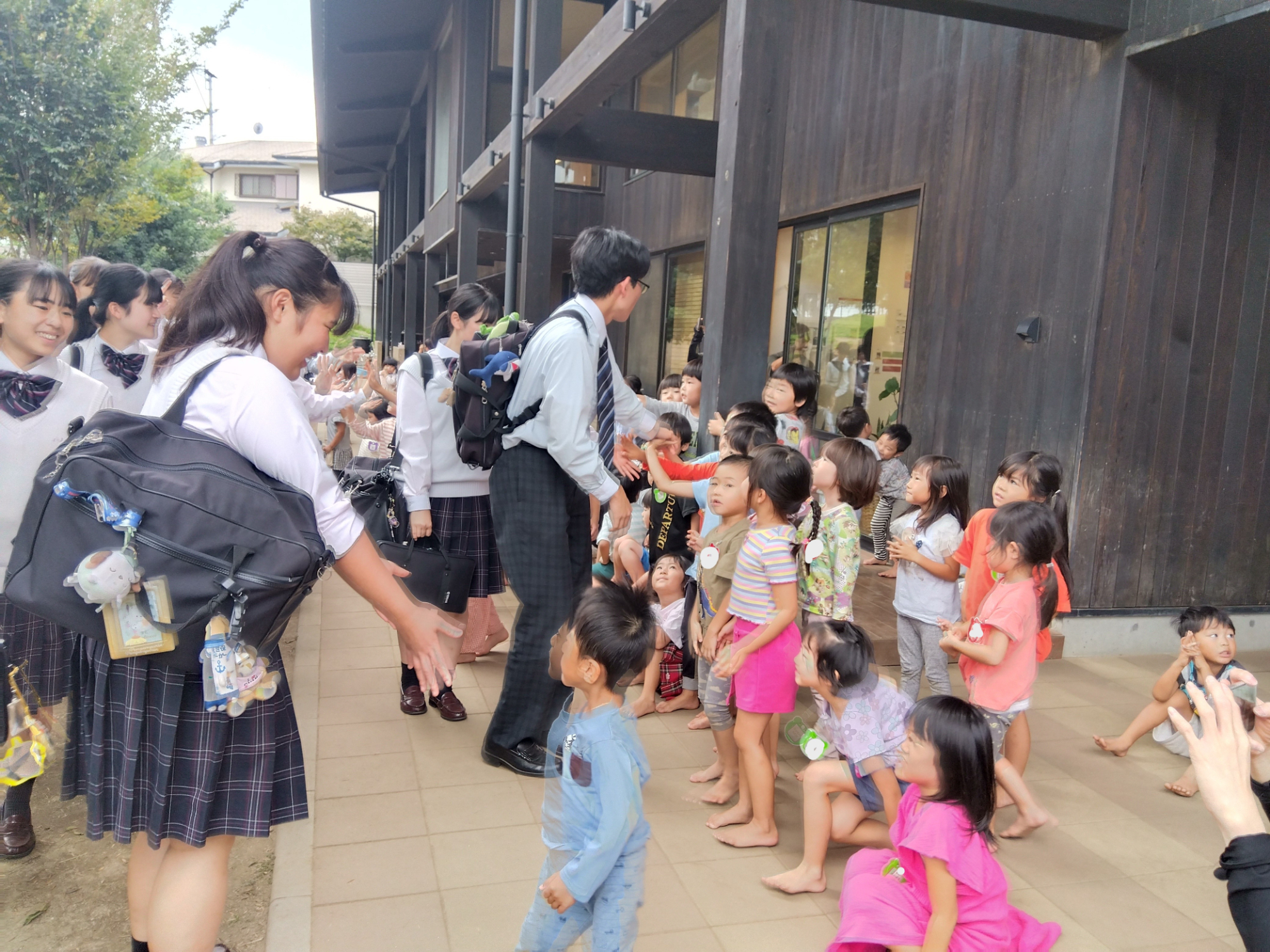 子どもたちはお別れするのが名残惜しそうでしたが「また来てね」とみんなで玄関までお見送りに行きました。お兄さんお姉さんたちも「また来るよ」と言ってくれて、とても良い体体験となりました。この経験を通して、0歳から4歳の楽器遊びが活発になったり、5歳のクラスでは鍵盤ハーモニカで演奏したいという気持ちが芽生えてきたりしています。次回は一緒に演奏できたらいいなと思います。
