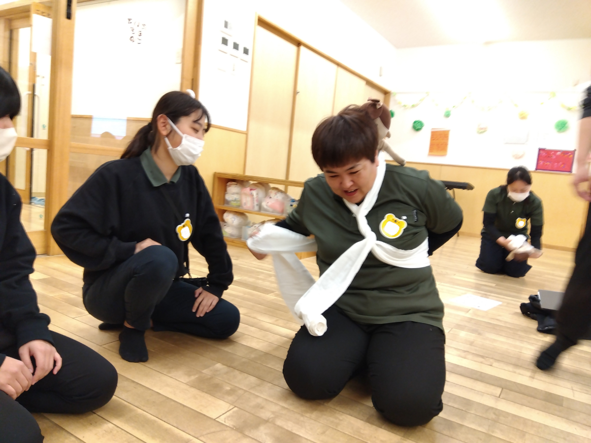 どろんこ会では、4月の新年度をスタートする前に、「4月1日に起こるかもしれない大災害や事故に落ち着いて正確に対処する」「大事なルールを理解する」事をねらいとし、全スタッフでマニュアルを確認したり、おむつ交換や嘔吐処理の手順、エピペンやさらしおんぶのロールプレイを実践したりしています。今回は三筑どろんこ保育園で行った研修の中からエピペンとさらしおんぶのロールプレイの様子をお知らせします。