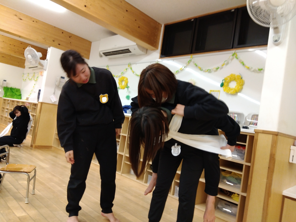 さらしおんぶは「さらし」を使っておんぶをする方法です。災害時におんぶ紐がない状況でも活用できます。首が座った子から使うことができます。おんぶ紐を使わなくても全員が実践できるように交代しながら、人形や保育者が子ども役をしてロールプレイを行いました。一人で子どもを背負ったり、さらしをお尻の下に通すことが難しかったりと、皆、悪戦苦闘していました。ポイントを皆で丁寧に確認をしていくことで理解が深まったようです。