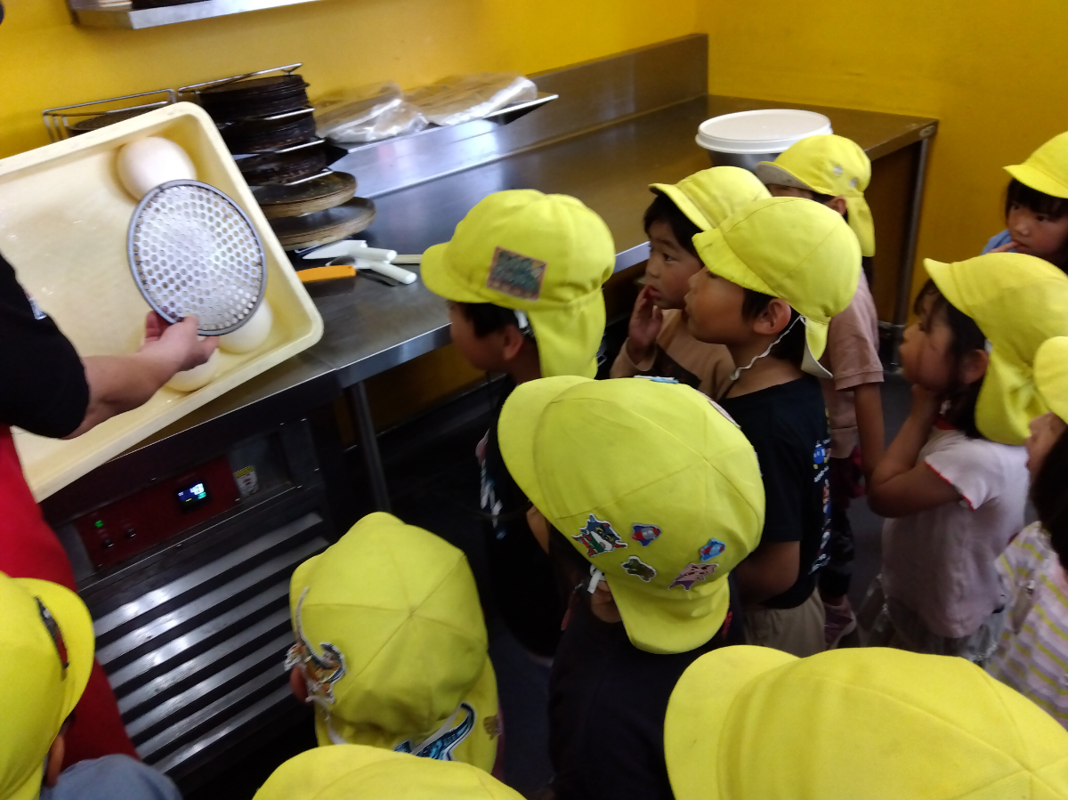 お店に到着すると、「おはようございます。」「よろしくお願いします。」と元気に挨拶をしていました。お店の方の計らいで、普段入ることができないキッチンの中に入り、ピザを実際に作る様子を見せていただけることになり、大喜びの子どもたちです。