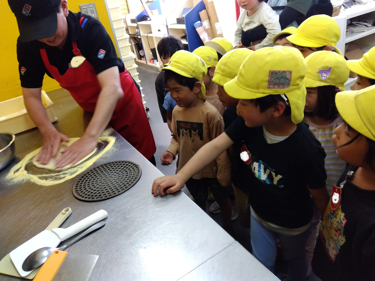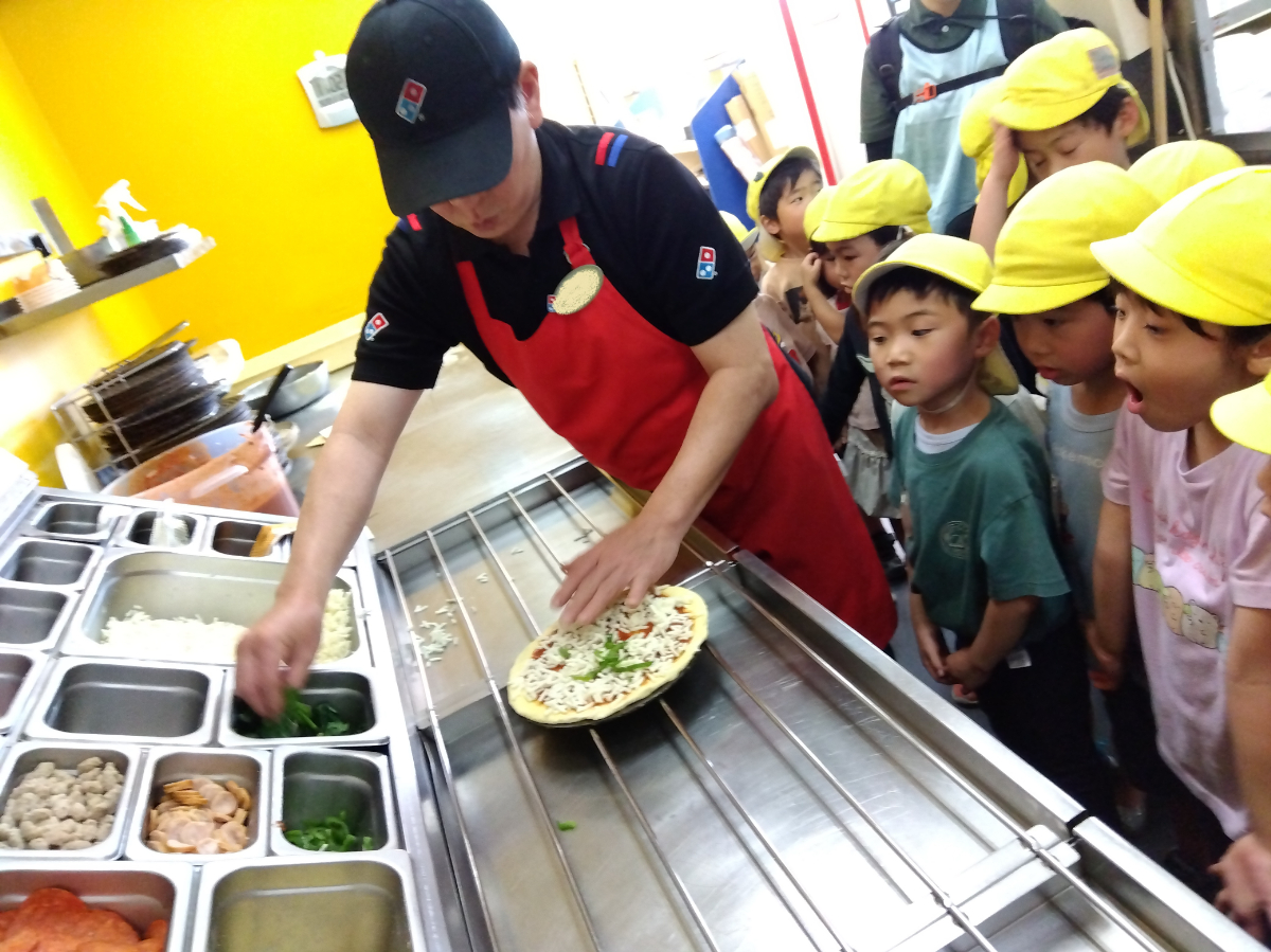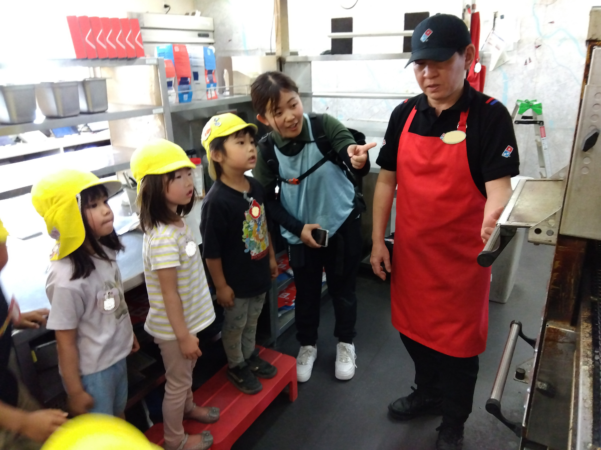 先日はデリバリーピザの店を訪問しました。散歩で公園に出かける際に前を通るので、皆、お店の場所は知っています。出発前から「どんなピザがあるかな?」「お店の前を通る時、いいにおいがするよね。」と興味津々の子どもたちでした。