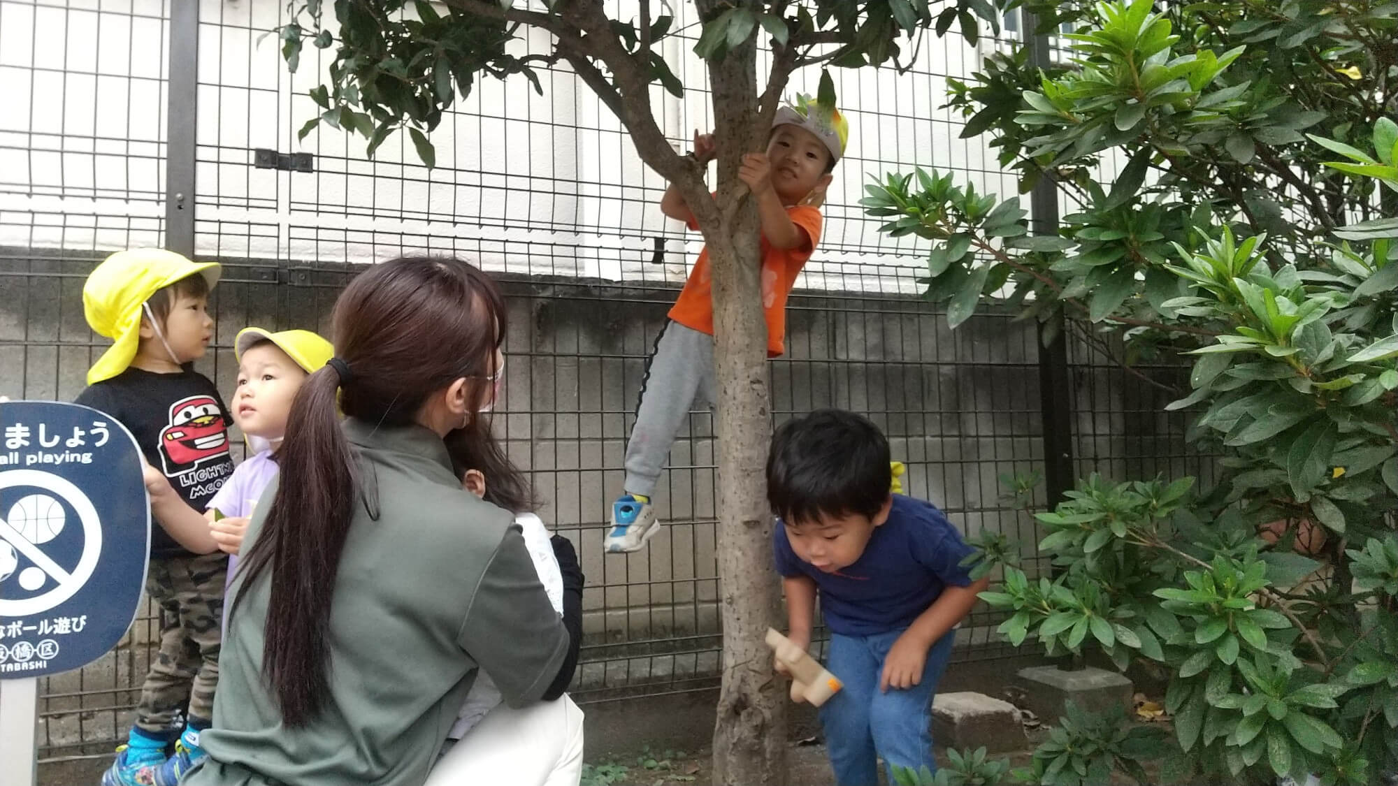 天気の良い日は、午前と午後の1日2回散歩に出かけます。子どもたちの発達や活動の目的に応じた片道10分~40分圏内の公園へ行き、木登りや土山登り、季節の動植物探しなどを楽しんでいます。