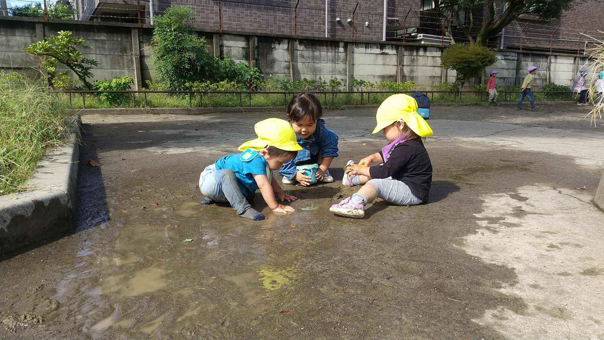 雨上がりの日には、子どもたちは植物に付いたしずくちゃん(水滴)を探して触れ、水たまりがあればどろんこ遊びを始めます。