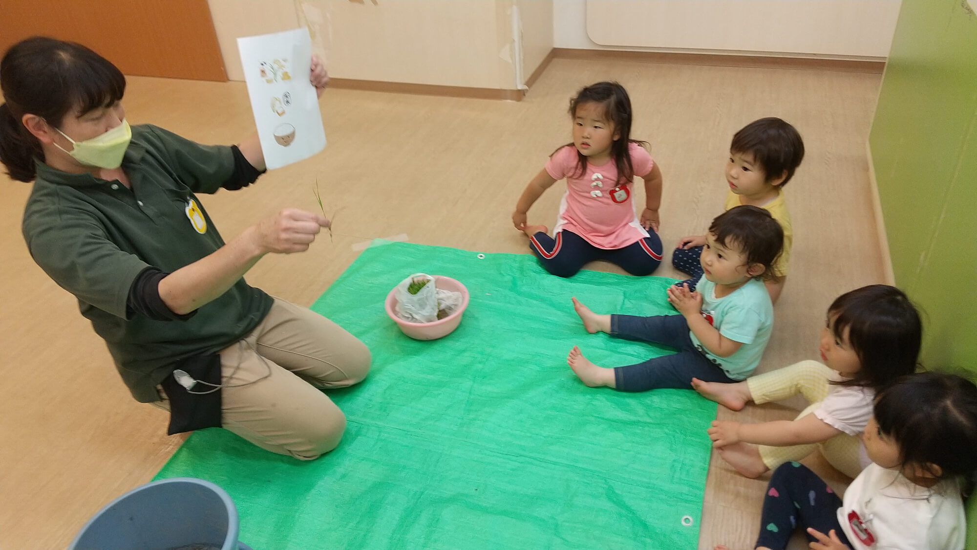 どろんこ会では田植えツアーなども行っておりますが、メリー★ポピンズ 成増ルームの子どもたちにもお米の育成を身近で感じさせたいと思っていたところ、他園から稲を譲り受けることができました。