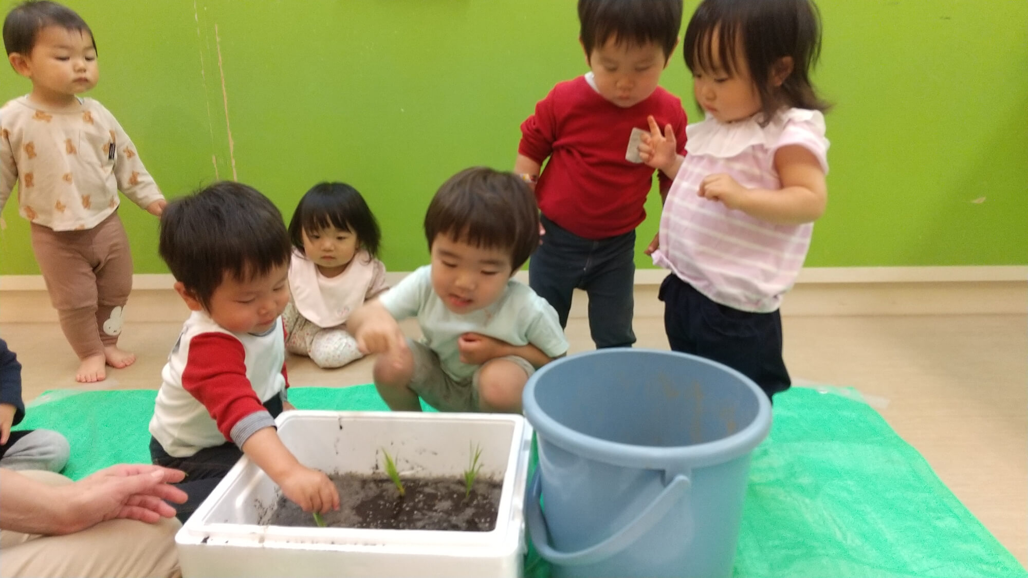 あずき組の子どもたちは発砲スチロール容器よりも小さなバケツ稲植えに挑戦しました。