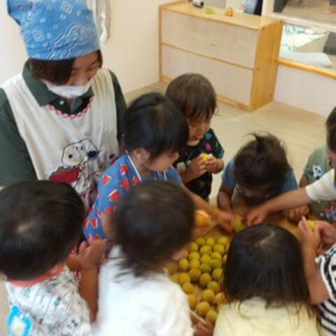 中身はお待ちかねの、たくさんの梅が詰められていて、子どもたちも保育者も、梅の香りを胸いっぱいに吸い込み皆に笑顔が広がりました。