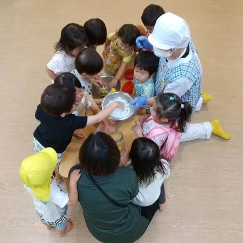 調理士がボウルに入れた氷砂糖と梅、塩と容器を持ってくると「なになに?」と子どもたちが集まってきます。