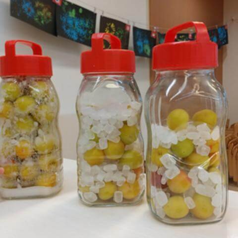 へたをとりしっかり拭いた梅と氷砂糖を交互に消毒してある瓶に、子どもたちで詰める作業を行いました。香りの良い梅もさることながら、氷砂糖にも興味津々で、手にとっていました。
