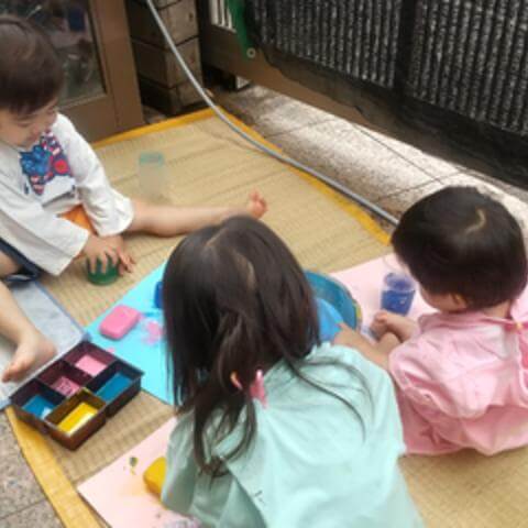 全身を使って体感することの大切さ、画用紙に表現するとともに、夏の暑さと涼を感じられた一日でした。変化する氷と自由自在に混ざる絵具に夢中で遊ぶ子どもたちはとても素敵な笑顔をしていました。