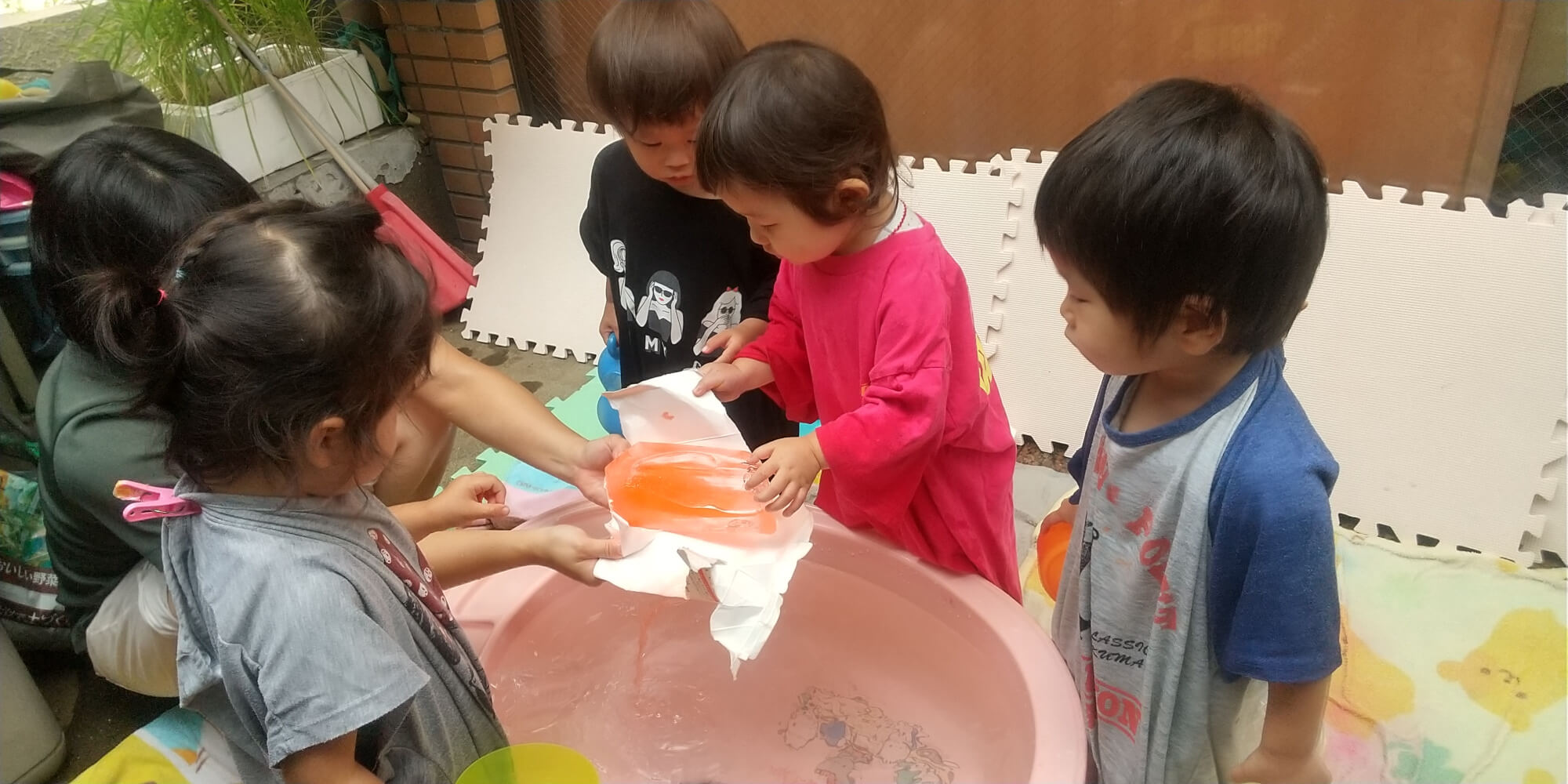 1・2歳児クラスはいつもの水遊びに氷絵具を使い、水に溶けていく様子や混じりあう色味を楽しんでいました。