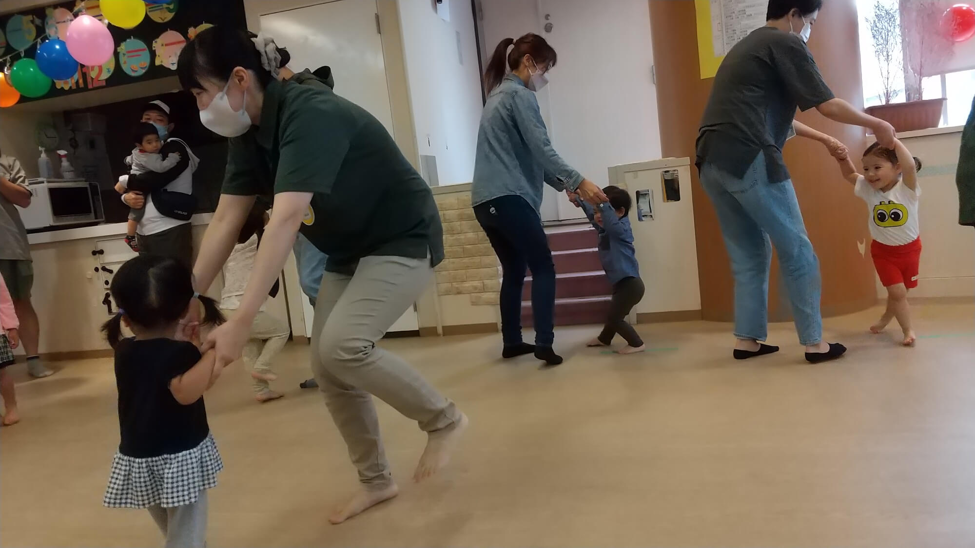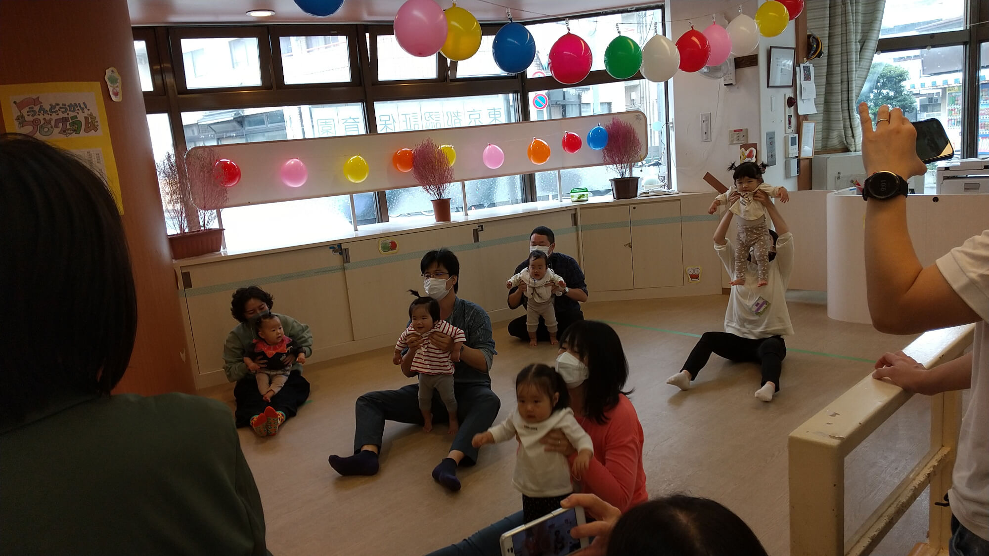 子どもたちはいつもと違う部屋の装飾や、大人が沢山いる中でキョロキョロ見渡しながら入室してきてくれました。絵本モチーフのふれあい遊びをした後のだるまさん探しでは、ヨチヨチ歩きを見せてくれたり、自ら探索をして発見しただるまさんを教えてくれたりしました。