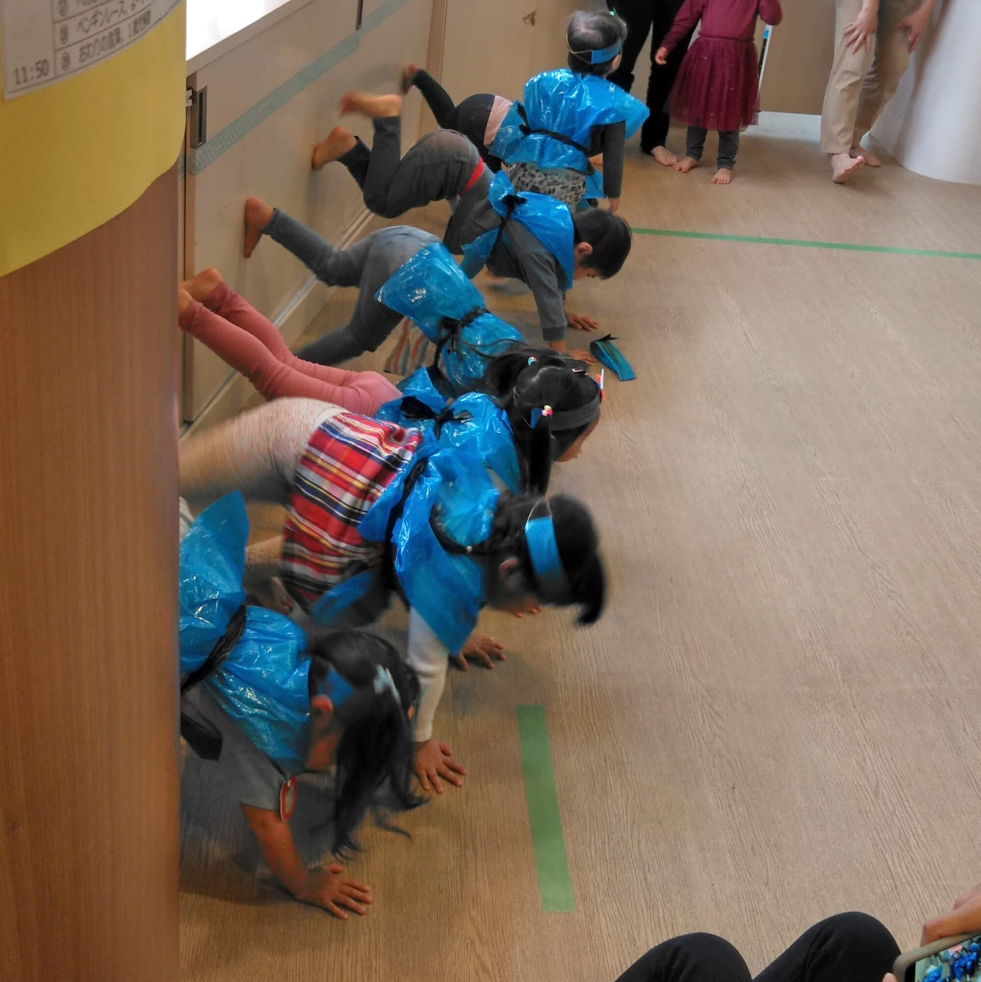 今年は忍者のテーマのもと、忍者になりきりダンスを披露したり、カードめくりや雑巾がけのある障害物レースをしたりして頑張りました。もちろん毎日行っているリズム体操も見ていただきました。去年は恥ずかしくてできなかった動きも堂々と披露している姿もありました。