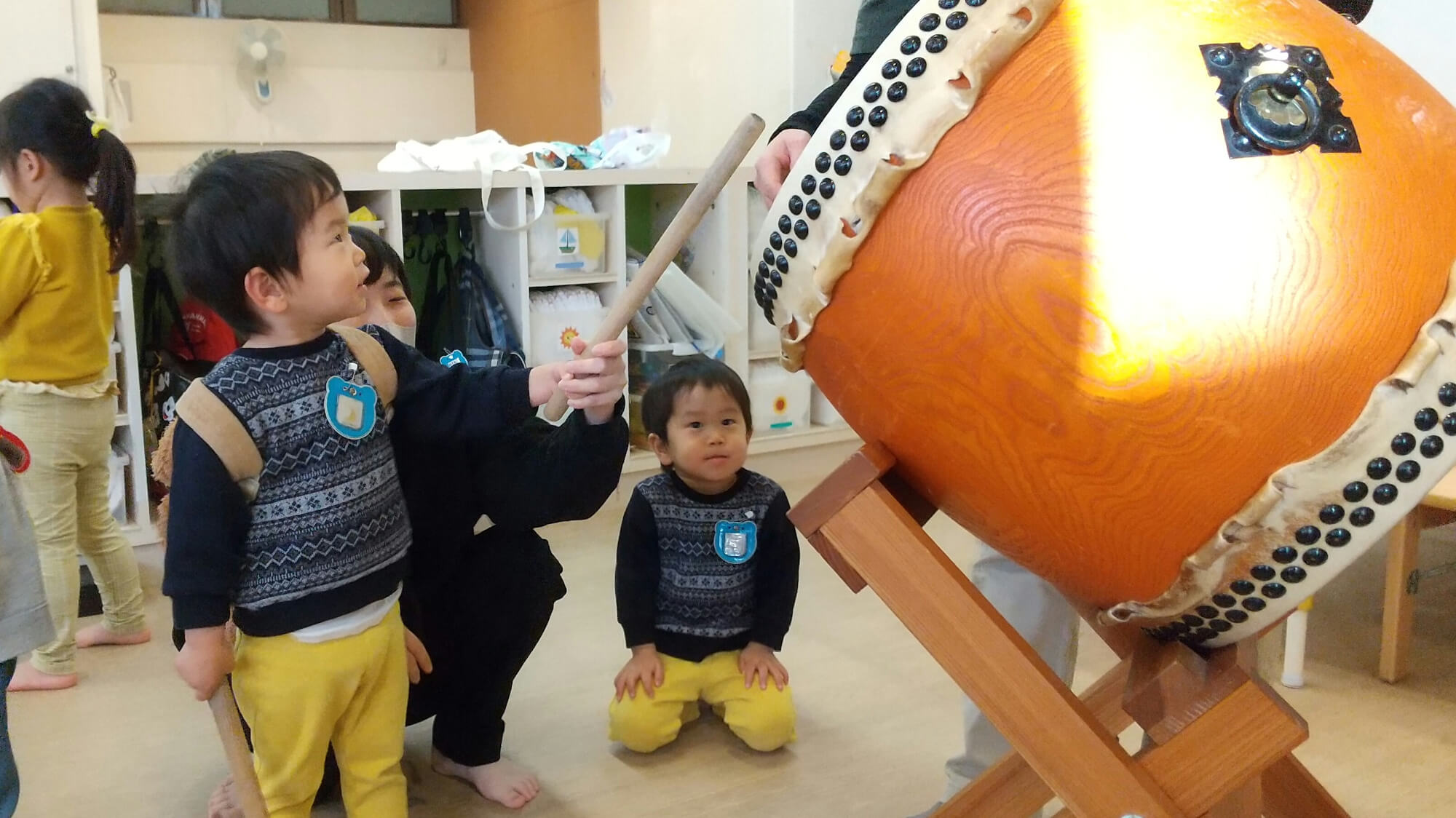 この日も太鼓を持参して保育室に持ち込んでいるとみんなが興味津々で集まりだしました。