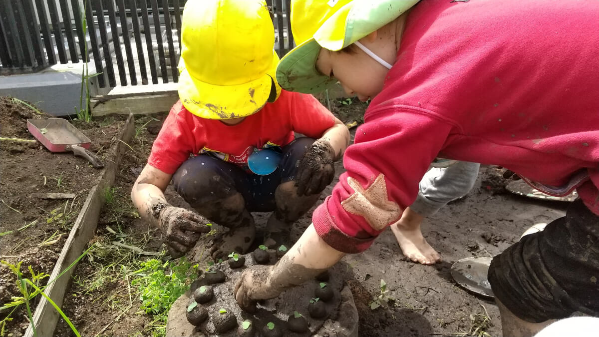 秋の風が心地よく、過ごしやすい気候の中、メリー★ポピンズ エスパル仙台ルームでは、園庭での泥あそびを楽しんでいます。泥の感触を手や足で存分に味わう姿や、泥を使ったごっこ遊びを楽しむ姿も多く見られます。