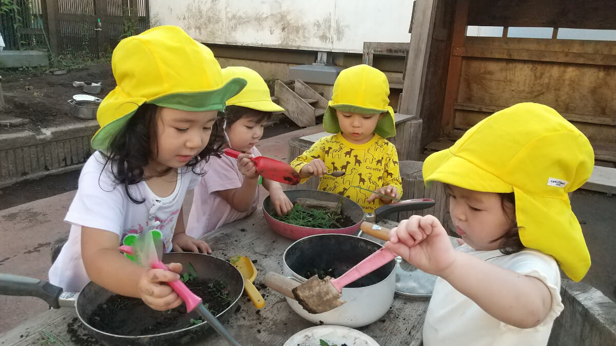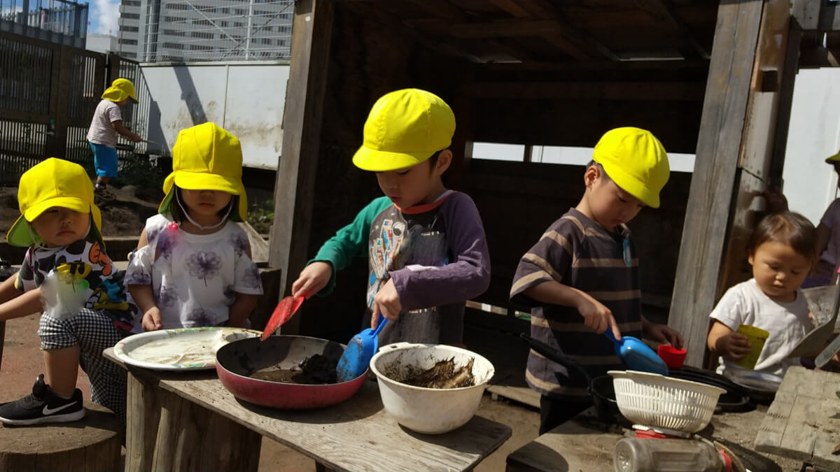 なかでも園庭にあるキッチンには、フライパンや鍋、ボウルにおたまなど、ままごとを存分に楽しめる玩具があります。園庭で遊ぶ際には、異年齢の友達と一緒にままごとをしたり、レストランごっこのなかで様々な料理を作ったりして、泥あそびを楽しんでいます。