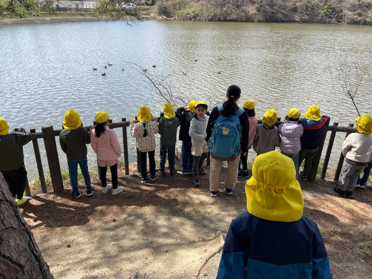 目的地の与兵衛沼公園は人工の水辺や自然林が広がっており、水辺では鴨や白鳥、鯉が泳いでいました。子どもたちは、動くと後ろをついてくる鴨に興味津々の様子でした。