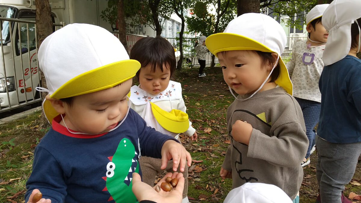 探索中に自然物を見つけると保育者に見せたり、集めたりして楽しそうに遊ぶ姿が見られます。保育者がどんぐりなどを集め、手に乗せると子どもたちはそれを見て、周りに落ちている自然物を拾って次から次へと手に乗せてくれます。