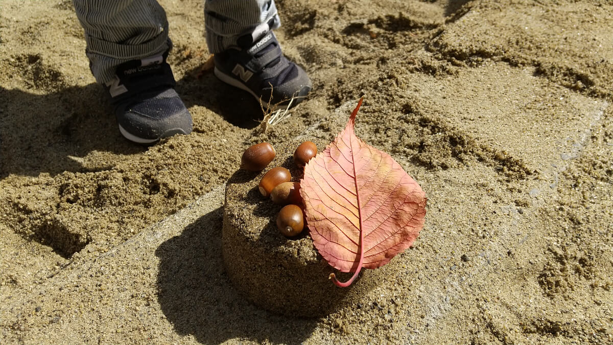 砂場では、拾ったどんぐりや落ち葉を使って友だちや保育者と一緒にケーキを作る姿がありました。どんぐりをいちごに見立てたり、木の棒をろうそくに見立てたりと想像力を膨らませて思い思いに楽しんでいます。