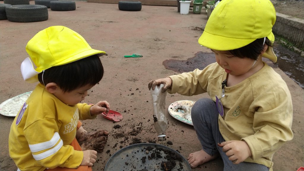 園庭では、手足を使い泥の塊を握ってみたり踏んでみたりと感触を楽しみ、木製キッチンで料理を作りお店屋さんごっこをしている子どもたちの姿も見られます。ひえ組の時に泥遊びに興味を示さなかった子どもたちも、保育者や友だちが泥遊びを楽しむ姿を見て 「やってみたい」という気持ちが芽生え、泥遊びを始めて遊びの幅が広がった友だちもいます。子どもたちの「やってみたい」という気持ちをこれからも大事にしていきたいです。
