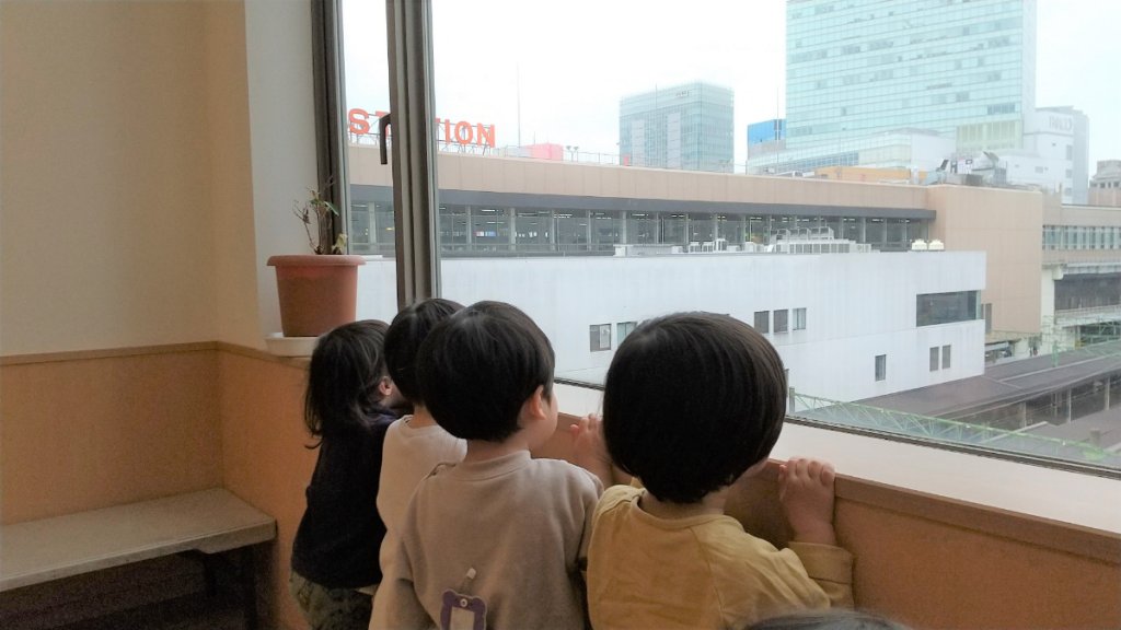 保育園の窓から新幹線のホームを覗いているあずき組。窓から新幹線のホームが見られるのは、メリーポピンズ エスパル仙台ルームならではの特権です。今までは背伸びをしても見られなかった景色が、やっと見ることができ「新幹線見えるよー!」と喜ぶ姿が見られました。子どもたちの心の成長と共に身体の成長も目の当たりにして、とても嬉しいです。