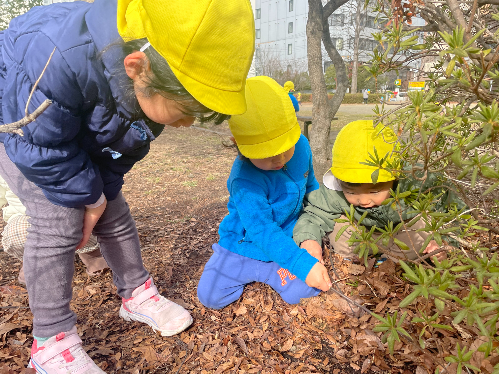 2歳児クラスの子どもたちが「虫さんどこかな~?」と枝を使い落ち葉をかき分けていると