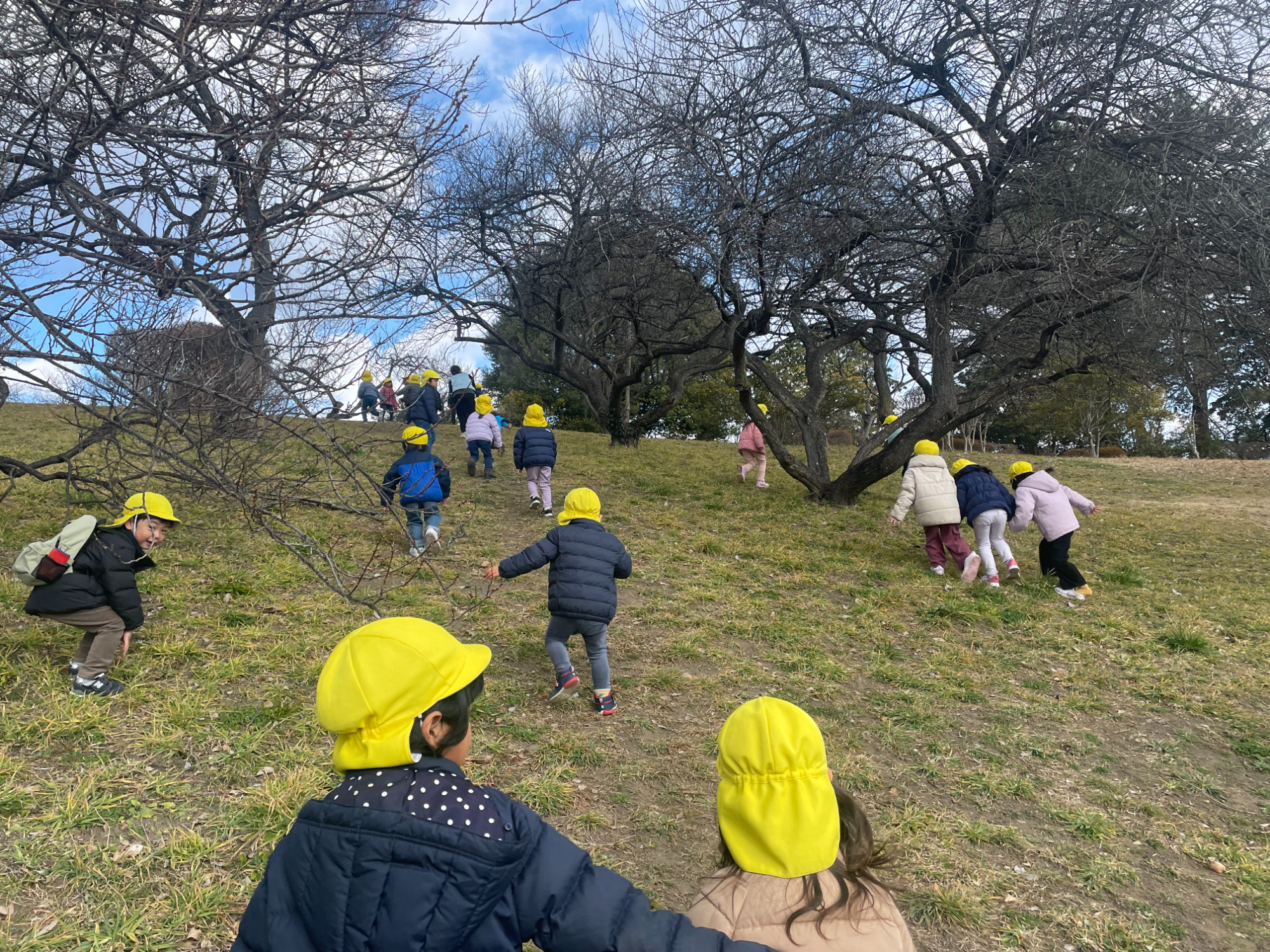 子どもたちは公園で山登りをしました。山登りが得意な幼児クラスの子どもたちが登り切った後に後ろを振り返ってみると、なかなか登ることができない2歳児クラスの子どもたちの姿がありました。
