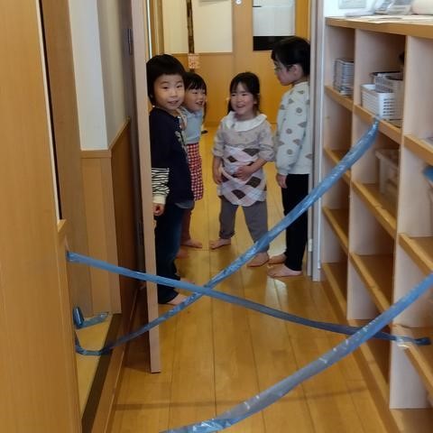 乳児室ではスズランテープや新聞紙を使い、部屋を迷路やクモの巣のようにして遊んでいました。部屋に入る際は玩具をコイン代わりにして入場できるようにしたようで子どもたちに大人気でした。友だちが遊びに来ると友だち同士で「歩いてね」「ぶつからないように気を付けてね」と言葉を掛け合う姿が見ることができ、ほっこりした気持ちになりました。部屋に戻ると、「すごく楽しかったよ!先生も今度一緒に行こうよ!」と、どんな遊びをしてきたか、どんなところが面白かったのかをたくさん教えてくれました。