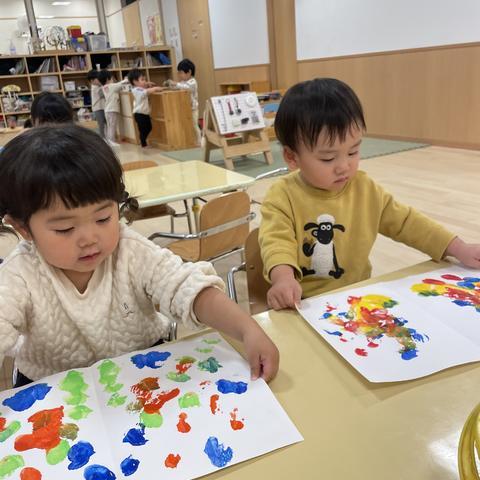散歩に行く前にひえ組(1歳児クラス)が制作活動でデカルコマニー(転写)を楽しんでいました。椅子に座り、真っ白な画用紙に自分の好きな色を選び、思い思いに色の変化を楽しむ様子が見られました。午後になると、乳児クラスは幼児室を行き来し、幼児の友だちと一緒に粘土や塗り絵、お絵描きをする姿が多く見られました。製作活動をする時は集中して取り組む姿が見られ、「みてーみてー!」と保育者ににっこり微笑み、作品を見せてくれました。