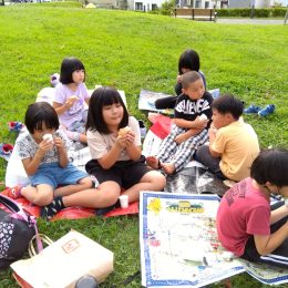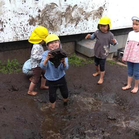 園庭では、泥の感触を体全体で感じ、豪快に楽しんだり、ごっこ遊びを楽しんだりする姿が見られます。異年齢児で玩具の貸し借りをしながら、関わっている姿が見られました。また、プランターの野菜の水やりも率先して行い、「僕たちが育てているよ!」と嬉しそうに話す様子もありました。
