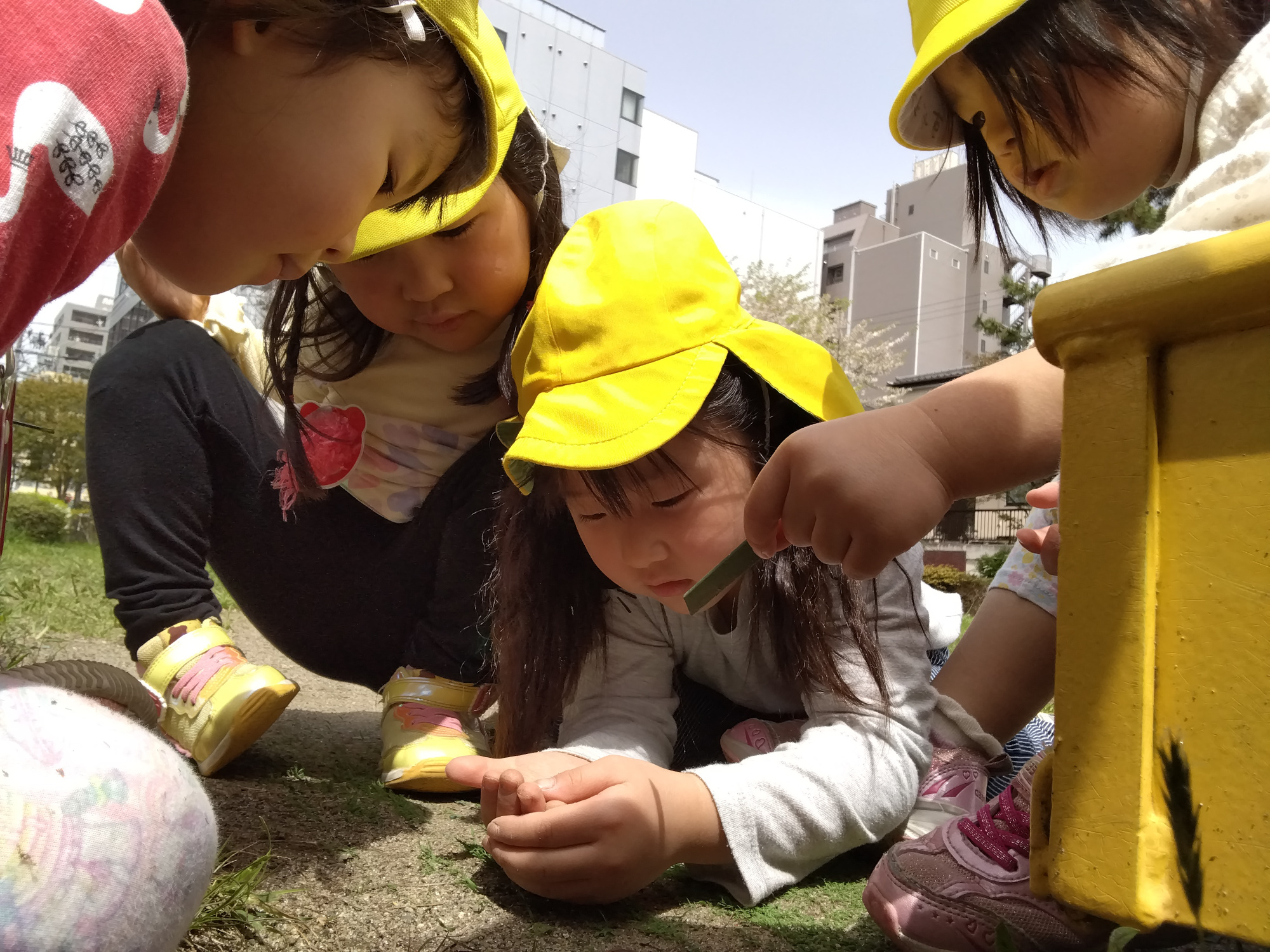 幼児は公園に行くと、春の動植物に親しみを持ち、「見て!見て!」と見つけた昆虫を見せに来てくれます。じっと観察する子もいれば、「この虫は何を食べるのかな?」「葉っぱ、草?それとも木?」と想像が膨らみ木を持ってくる子、草花を集める子と役割を分担し、家を作ったりエサを探したりしていて、生き物への関心や優しさが伝わってきました。