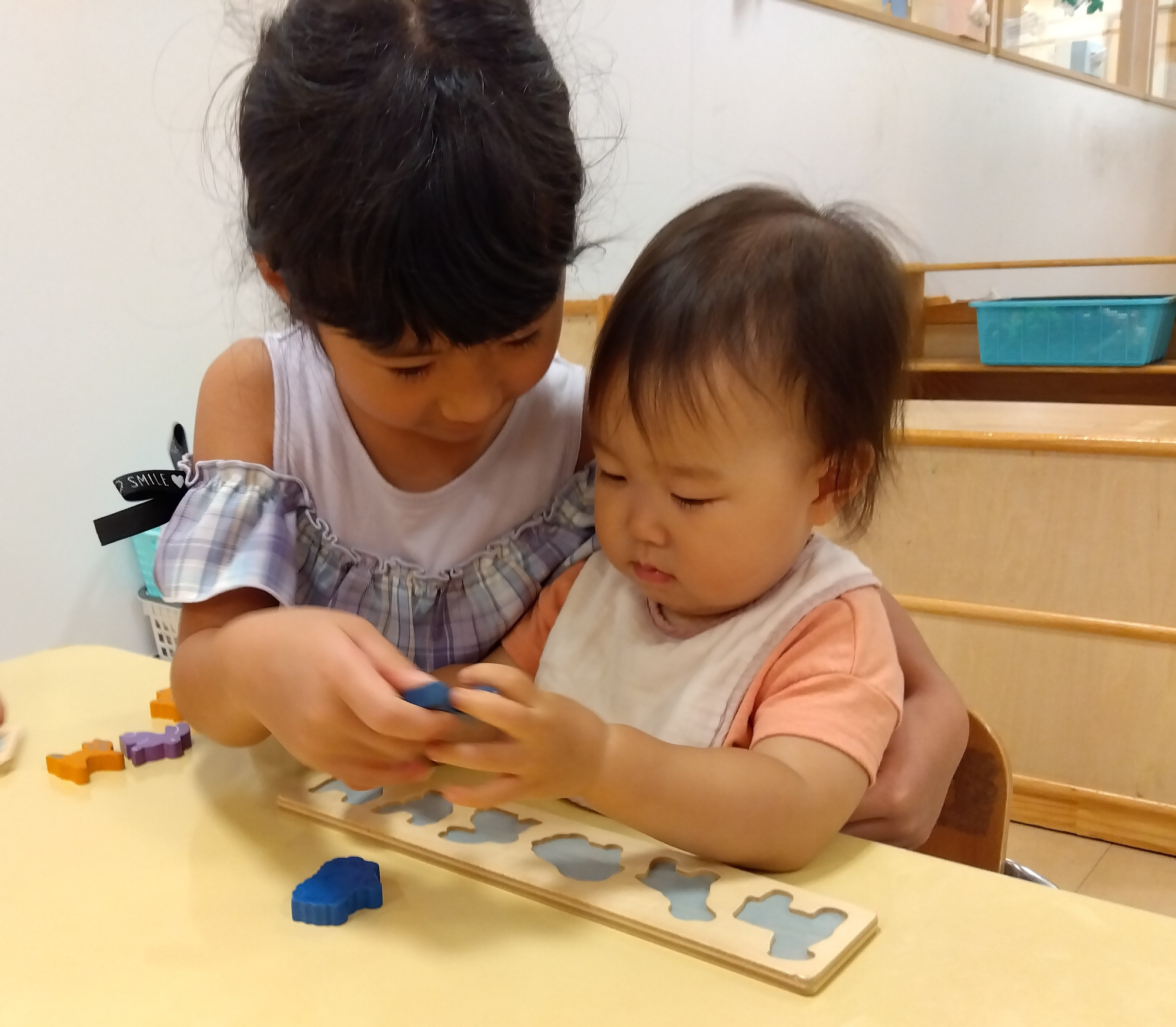 ひえ組(1歳児)の子が乳児室でパズルをしていると、こめ組(5歳児)のお姉さんが言葉をかけてくれました。どの場所に当てはまるのか、2人で試行錯誤しながら楽しんでいる姿にほっこりした一場面です。幼児のお姉さん、お兄さんはよく乳児の子どもたちを気にかけてくれて、お世話をしてくれます。自然と真似をして一緒に遊ぶ姿も見られ、どんどんできることが増えてきているひえ組の子どもたちです。