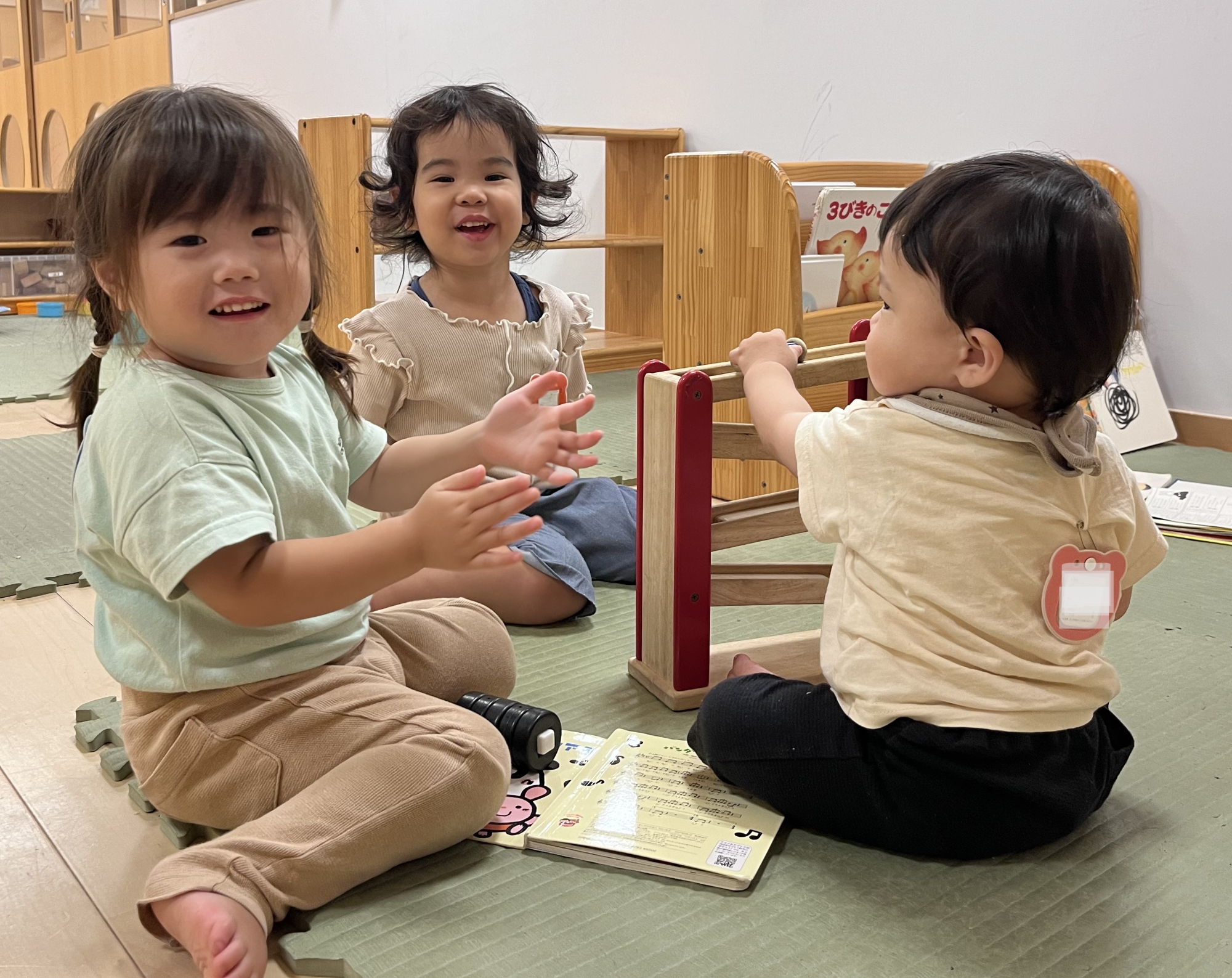 また別の日にはあわ組(0歳児)の子がスロープトイで遊んでいるところを見守っているひえ組とあずき組(2歳児)の子の姿がありました。年齢問わずみんなが大好きなおもちゃのため、順番待ちをしているようです。その姿を見守っていると、あわ組の子が楽しく遊べるように車を渡してあげたり、応援していたりする年上児の姿がありました。これまではお世話される側だったひえ組やあずき組も年下児との関わりが増えたことで、だんだんとお世話をしてあげたいという気持ちが芽生えたようです。