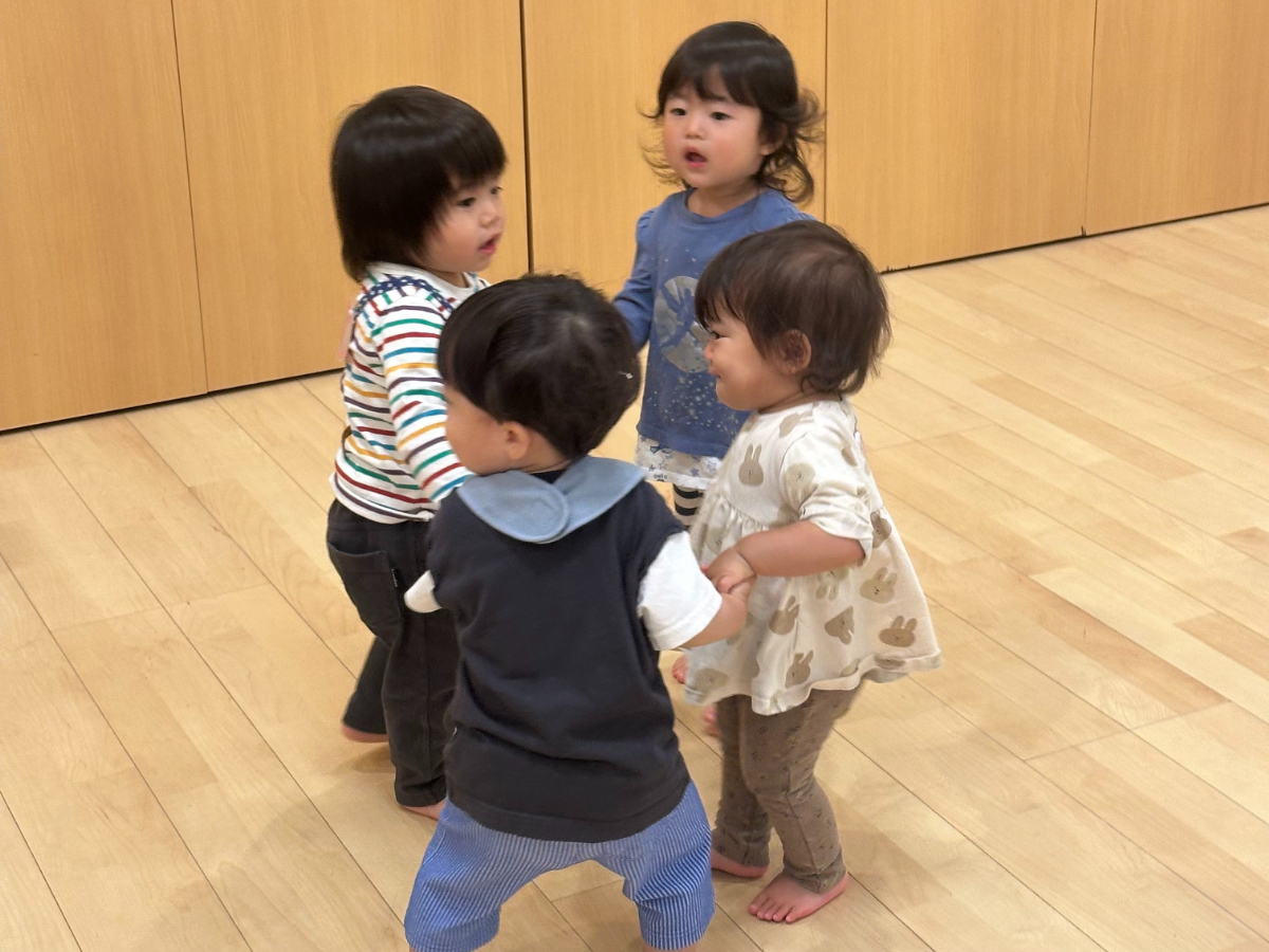 ひえ組では最近リズム体操を楽しむ姿が多く見られるようになってきました。月齢差の大きいクラスではありますが、保育者や友だちの姿を見ながら、見よう見まねでやってみようとしていたり、音に合わせて身体を揺らしたりしながらリズム体操に参加して楽しんでいます。「友だちと一緒に」という姿も増えてきて、友だちと手をつないだり一緒にやってみたりすることを楽しみながら、朝から元気に身体を動かしてリズム体操をしています。