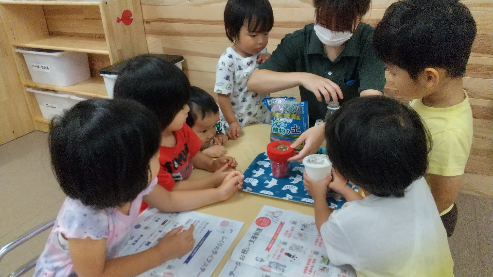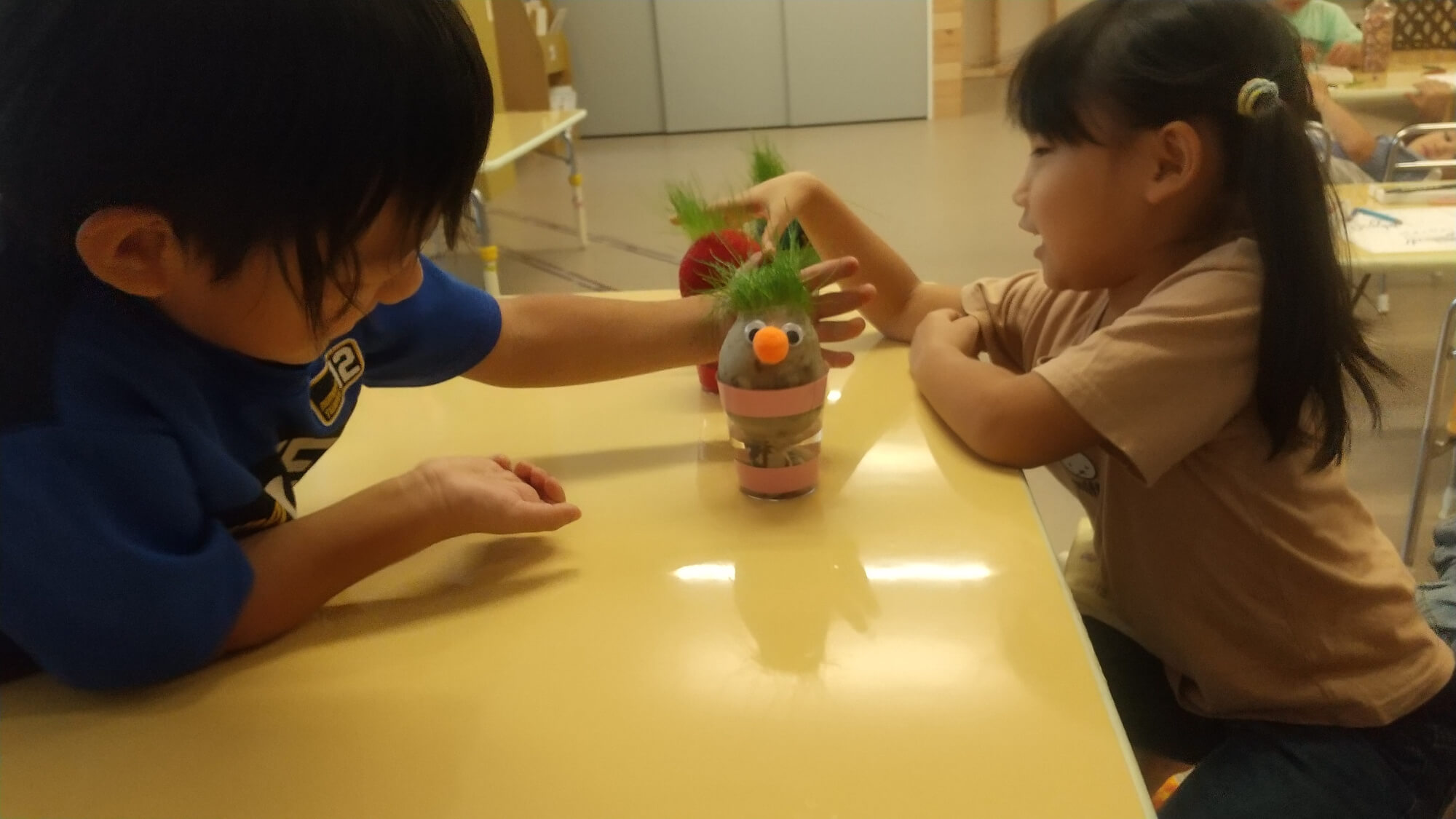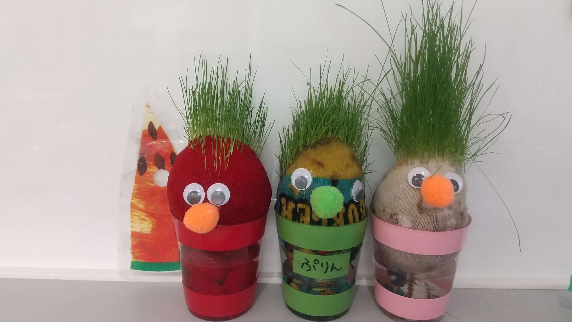 少しずつ伸びてくる草に気づいた子どもたちは「髪の毛みたい!」「結べそうだね」と愛着が湧いてきた様子でした。