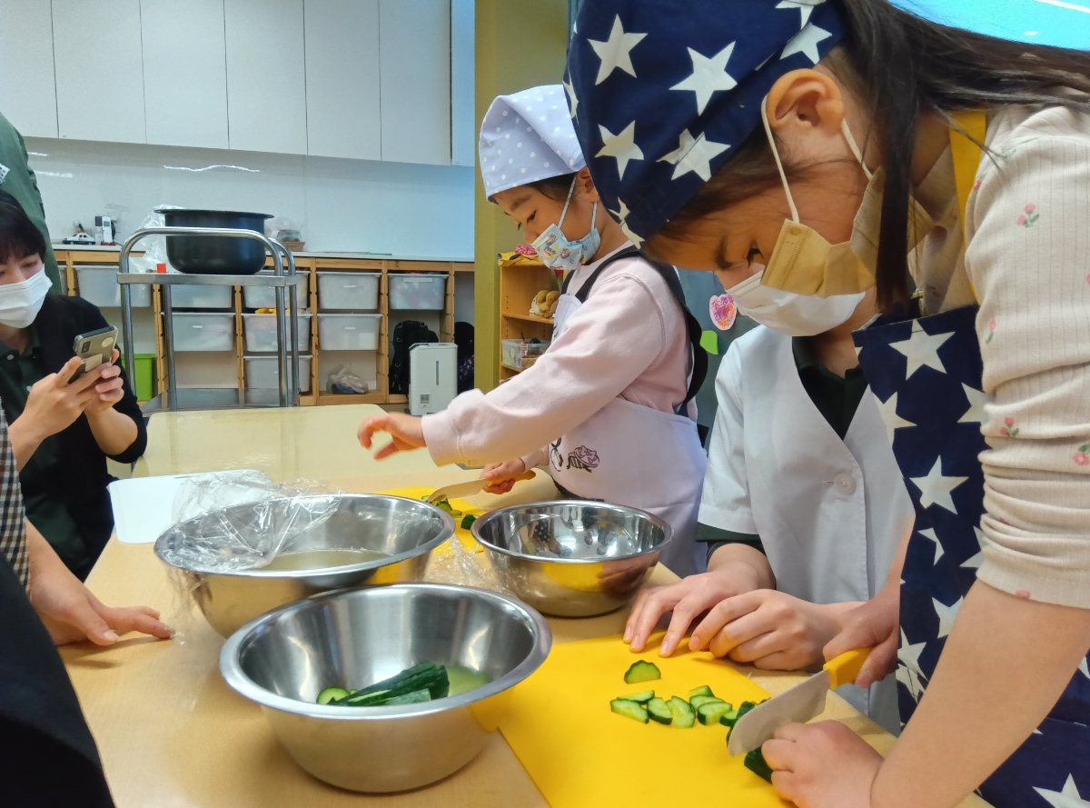 きゅうり・にんじん・玉ねぎの3種類を「猫の手にするんだよ」「もっと薄く切った方が良いよ」など様々に声を掛け合いながら一生懸命切っていました。