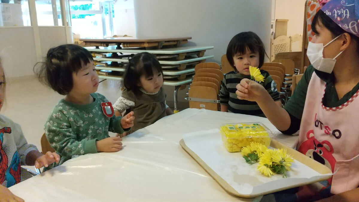 11月は季節の食材ということで、菊の花をちぎるという活動を行いました。