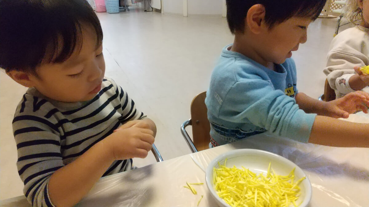 1歳児クラスは茹でたジャガイモを袋に入れて手で潰したり、野菜の型抜きをしたりと調理の1部を経験しています。2歳児クラスは包丁やピーラーを使用し、野菜を切る経験や切った野菜をホットプレートで調理して食べるなど、料理が完成するまでの1連の流れを体験しています。