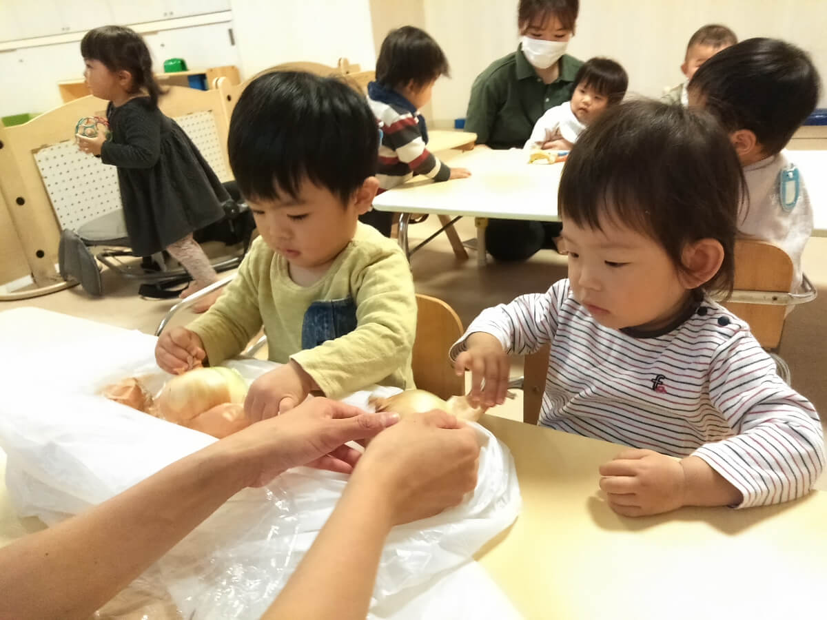 0歳児クラスは玉ねぎの皮むきを行いました。以前から1歳児クラスで行っていた野菜の皮むきですが、子どもたちの成長に伴い、今月は0歳児のクラスで行ってみました。こちらも最初は不思議そうな顔で見つめている様子でしたが、保育者がやって見せると、少しずつ手が伸びて、楽しむことができました。
