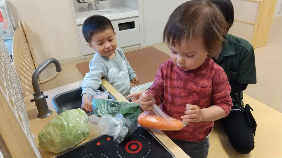 保育士が「これは何?」と聞くと「たまねぎー!」などと答えてくれました。みんな、とっても物知りです。
