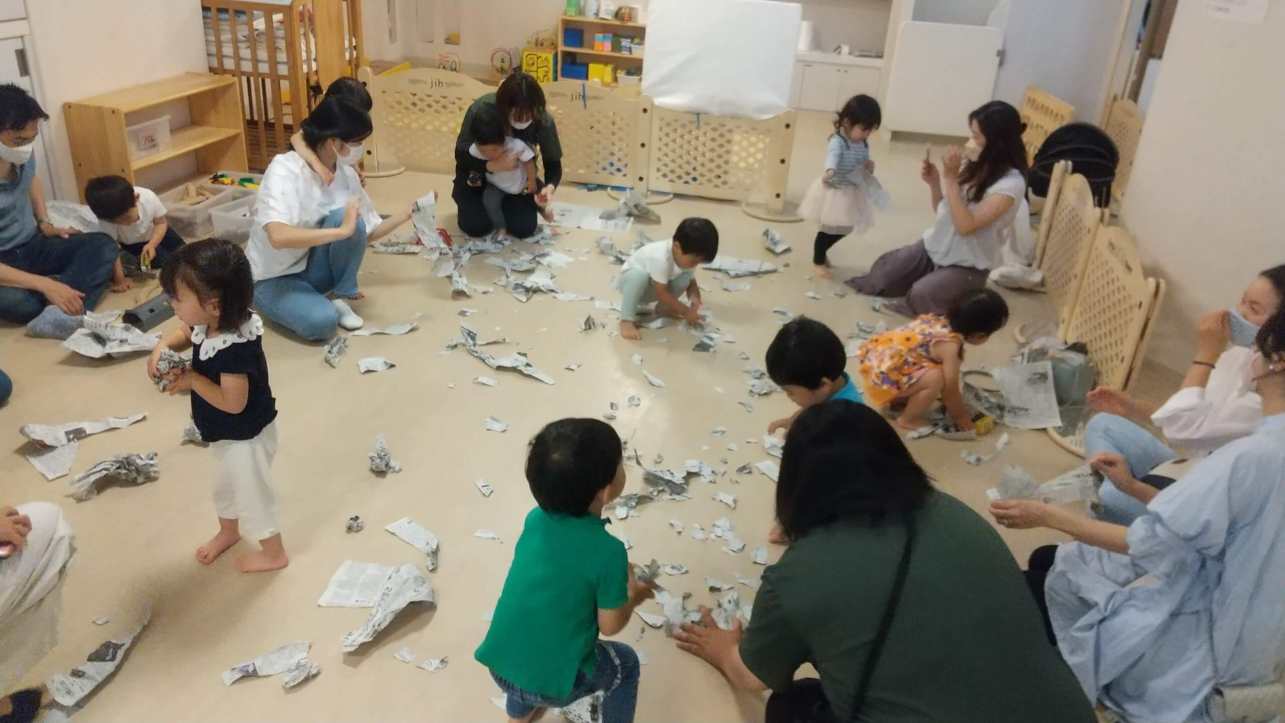 6月の子育てサロンは新聞紙をびりびりして遊びました。
