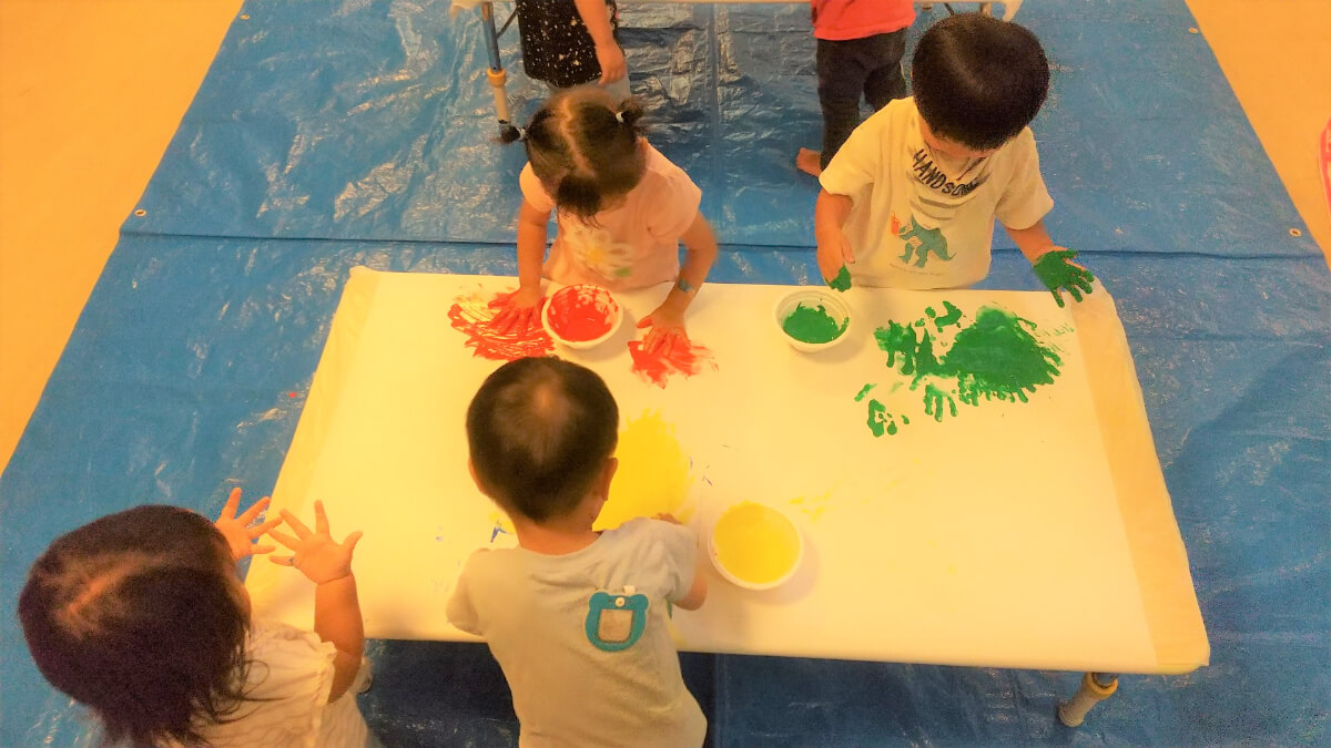 「何色を使おうか?」「混ざると色が変わるね」「手形がつくと面白いね!」「こっちの手はおおきいなぁ」「紙いっぱいの色がキレイだね」