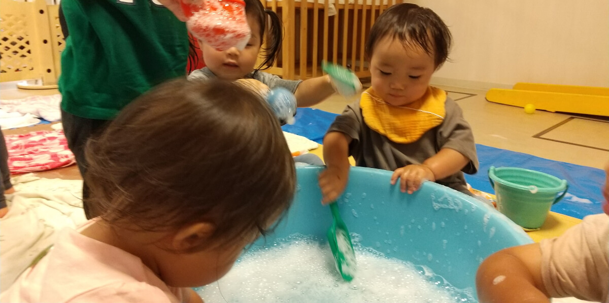 「お風呂みたいだね」とお互いの手を触ってみたり、泡をフーっと飛ばしてみたりして遊んでいました。また、食紅で色づけた氷や寒天などを水に入れて感触を楽しみました。
