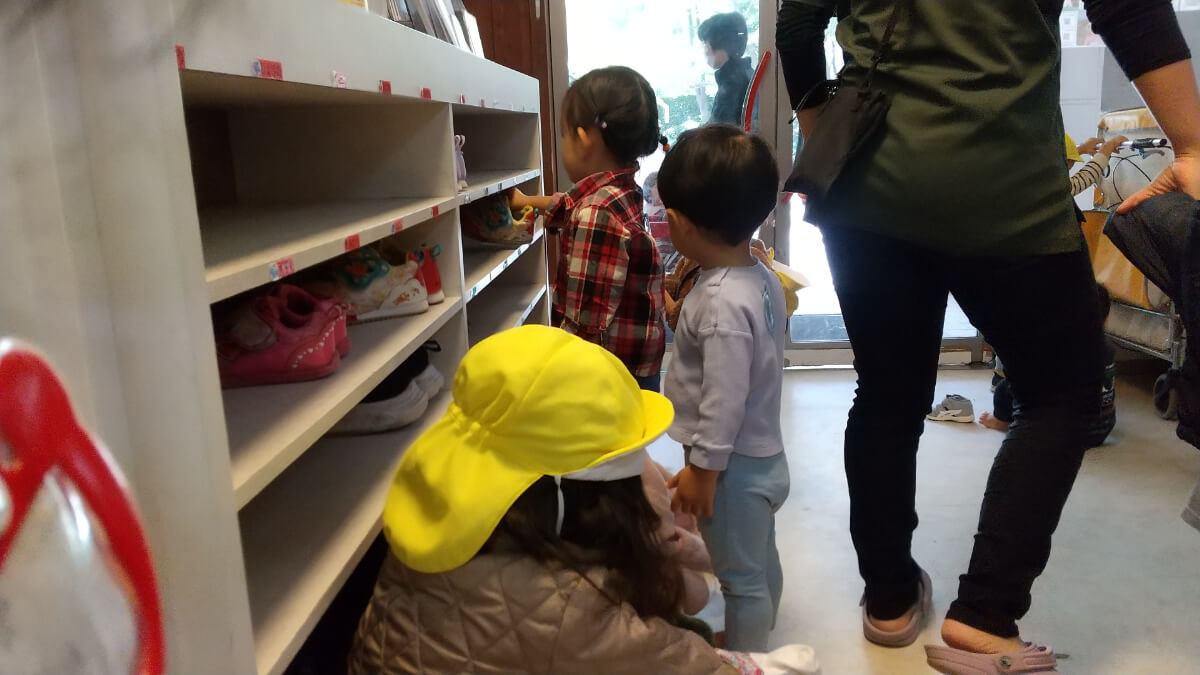 散歩に行く前は自分で自分の帽子を取り、靴を履きます。できない子には保育者や出来る子が手を貸します。