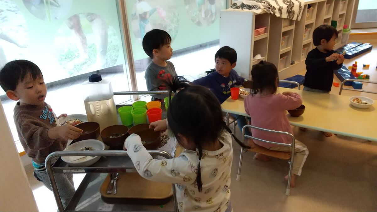 給食では2歳児を中心に自分でイスを席に運び、自分の給食を自分で持っていき、食べます。みんなが揃うまで待つのではなく、おなかのすいた子から順に自分で食べます。最近では、年上の子が年下の子の分を運んでくれるようになってきました。