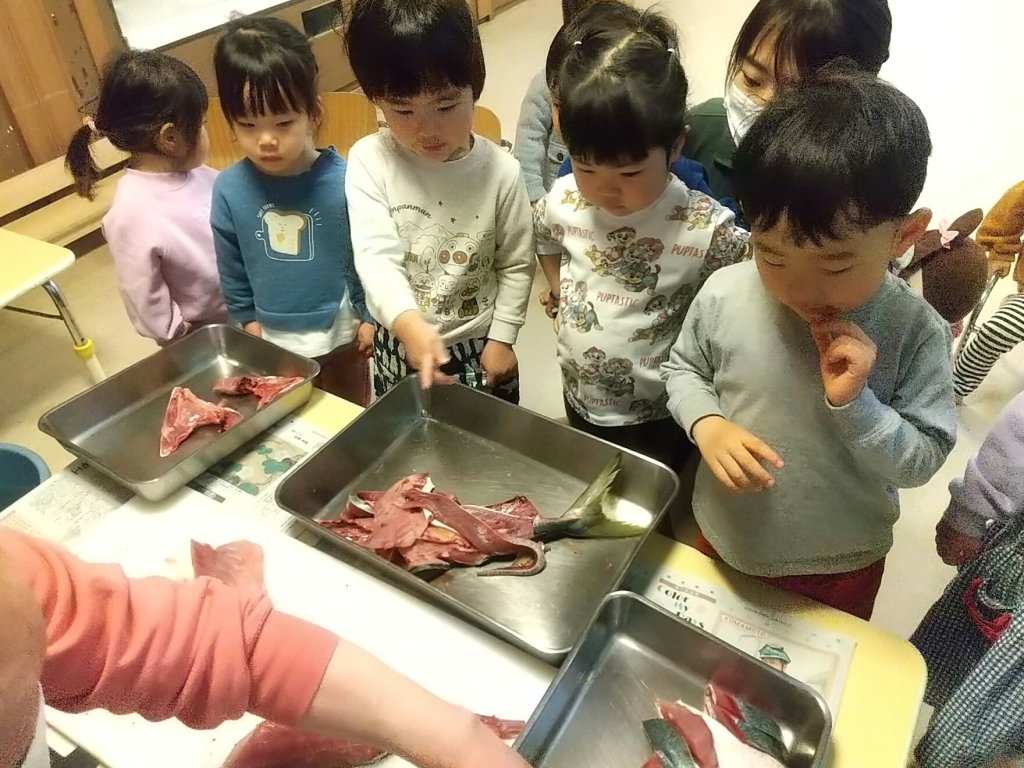 三枚おろしにしている写真です。頭を切り離し、身を三枚おろしにしていると「動いてないね」「死んでいるね」「これはなに?」「骨だよ」と子どもたちの声が聞こえてきました。