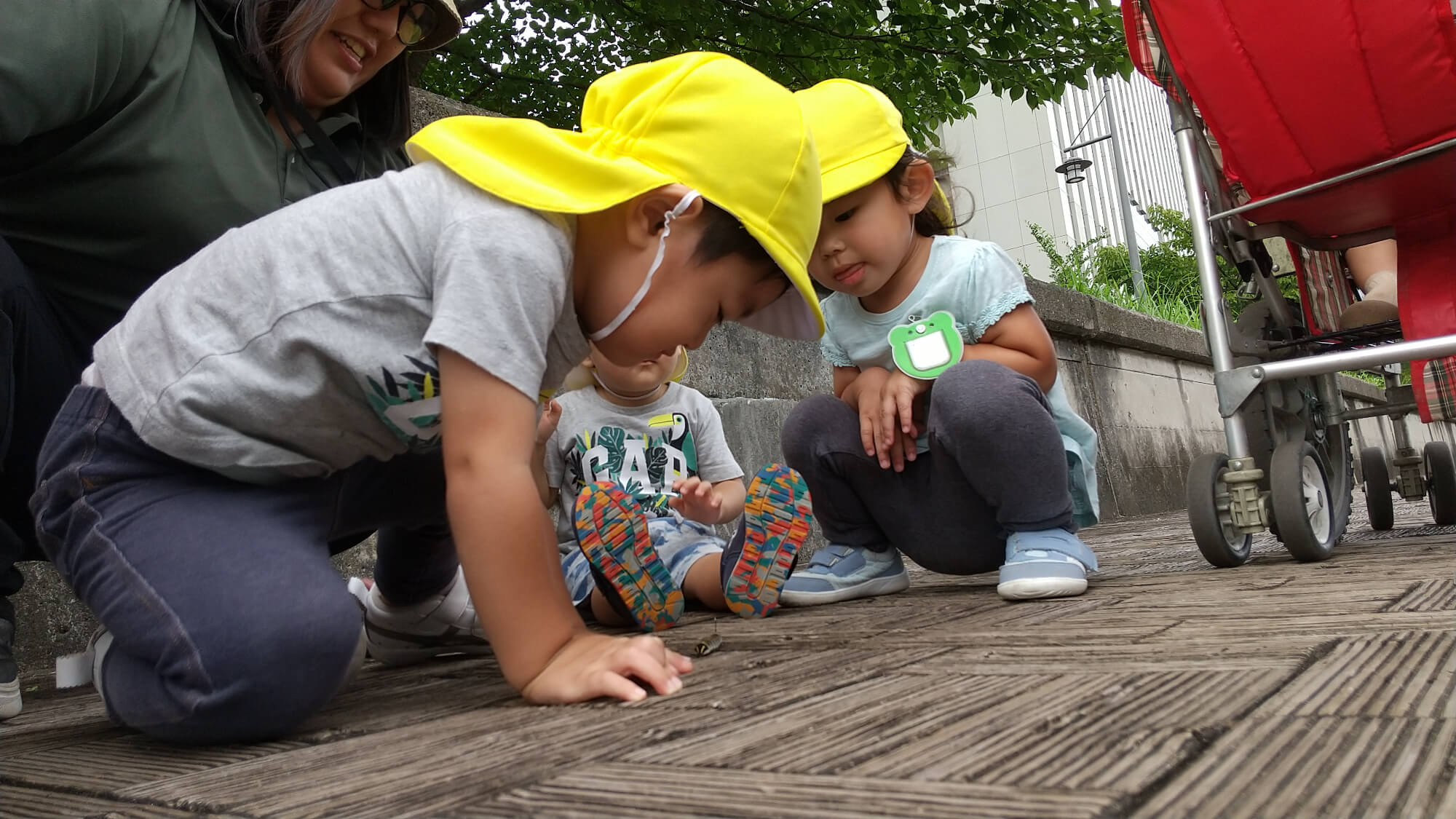 次に紹介するのは「セスジスズメ」という蛾の一種の幼虫のイモ虫を発見した時の様子です。運河沿いの遊歩道を散歩していた際に保育者が発見し、子どもたちに「何かいるよ」と話をすると、子どもたちは「なになに?」と気になった様子で集まってきました。保育者が調べたところ毒性はないということだったので、子どもたちに「触っても大丈夫だよ」と伝えたのですが、動き方や独特の色合いに少し驚いてしまったのか、直接触った子どもはいませんでした。それでも、イモ虫に興味はあったようで、顔を近づけて観察する姿が見られました。