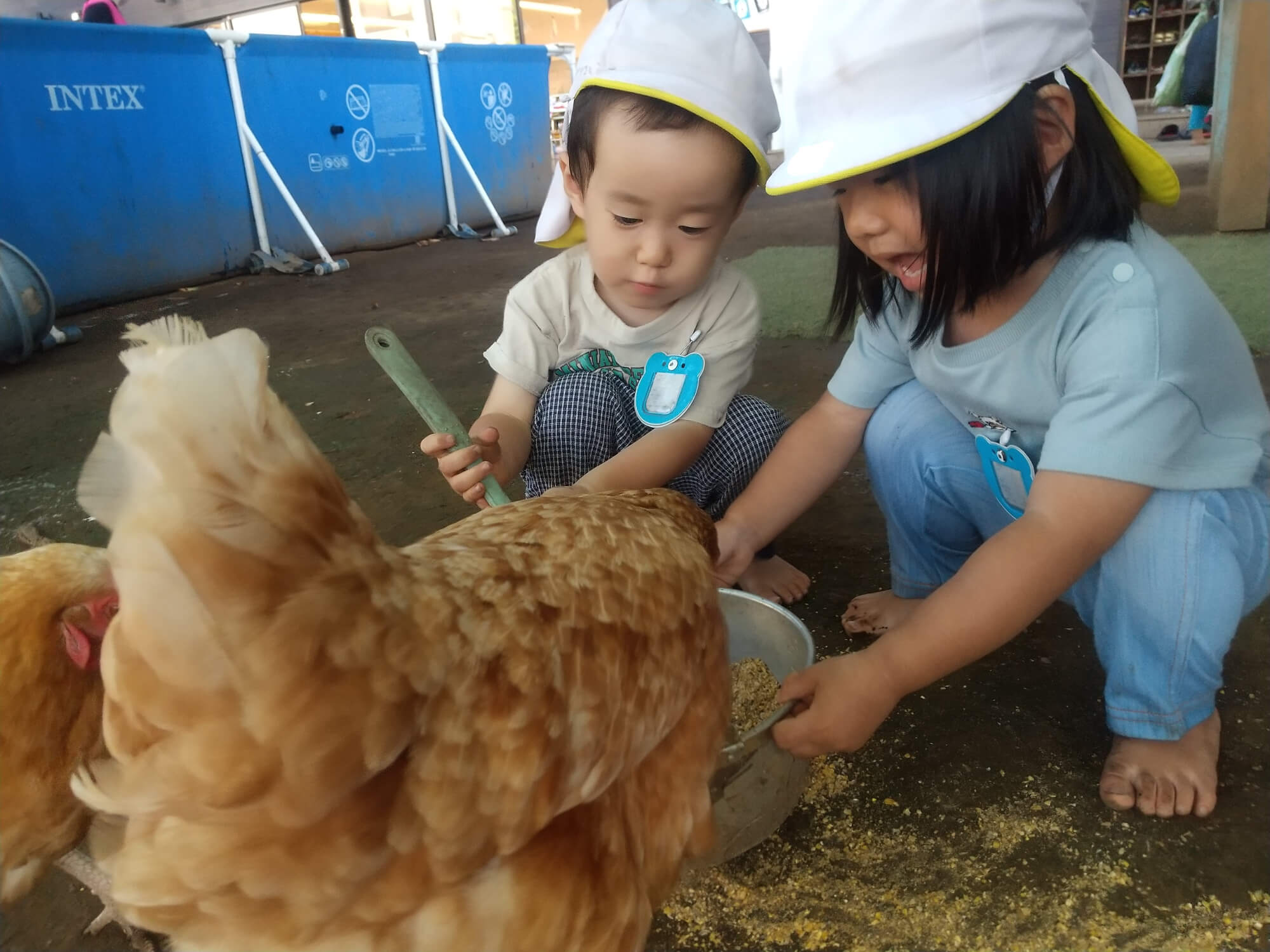 最後は「ニワトリ」との出会いを紹介します。このニワトリは北千住どろんこ保育園が飼っているニワトリです。初めての移動保育でニワトリに会った際には、近づいてくるニワトリから逃げていた子どもたちでしたが、少しずつ関わりを持っていくことで餌やりを自分たちでできるようになってきました。また、子どもと保護者様の会話の中で「今日ニワトリに触ったよ」や「ニワトリにご飯あげたの」等、ニワトリとの触れ合いを楽しそうに話す姿が見られるようになりました。