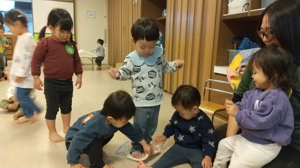 「これがうどんなの?」と不思議そうな目で見つめていました。保育者がお手本として袋に入った生地を踏んでいると、「ぼくもふみたい」「わたしもやりたい」と次々に生地を踏んでいました。また、子どもたちはどんどん力強く踏むようになっていき、保育者に手を取ってもらいながら両足でジャンプをして踏んでいる子どももいました。