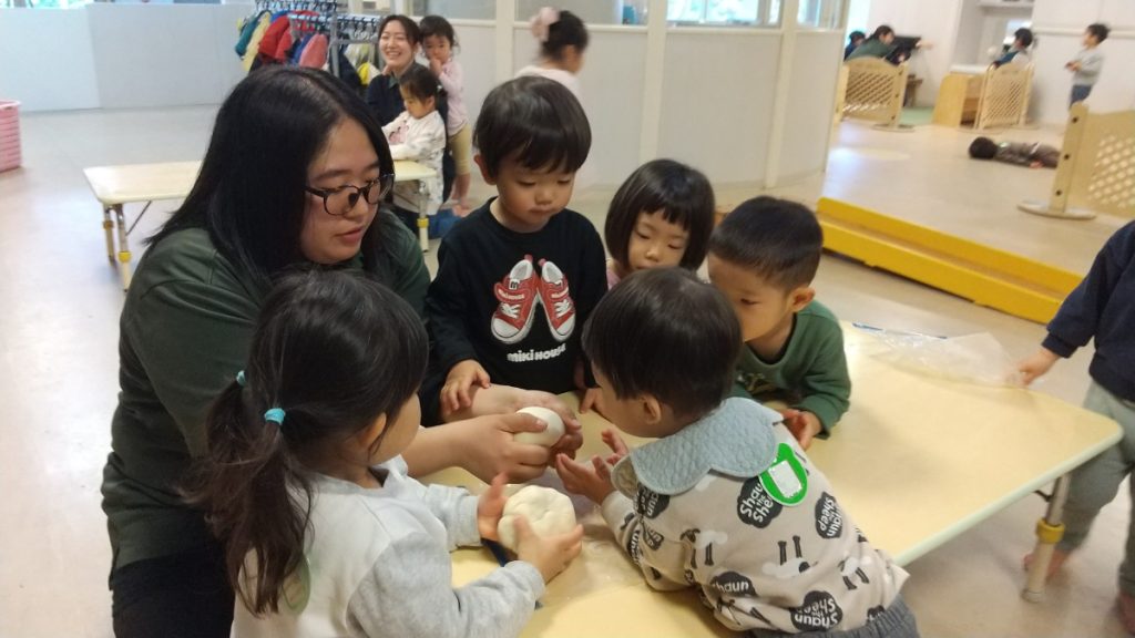 次は「実際に触って丸める」工程でした。この工程を行う前にきちんと手を洗い生地を触る準備を行いました。