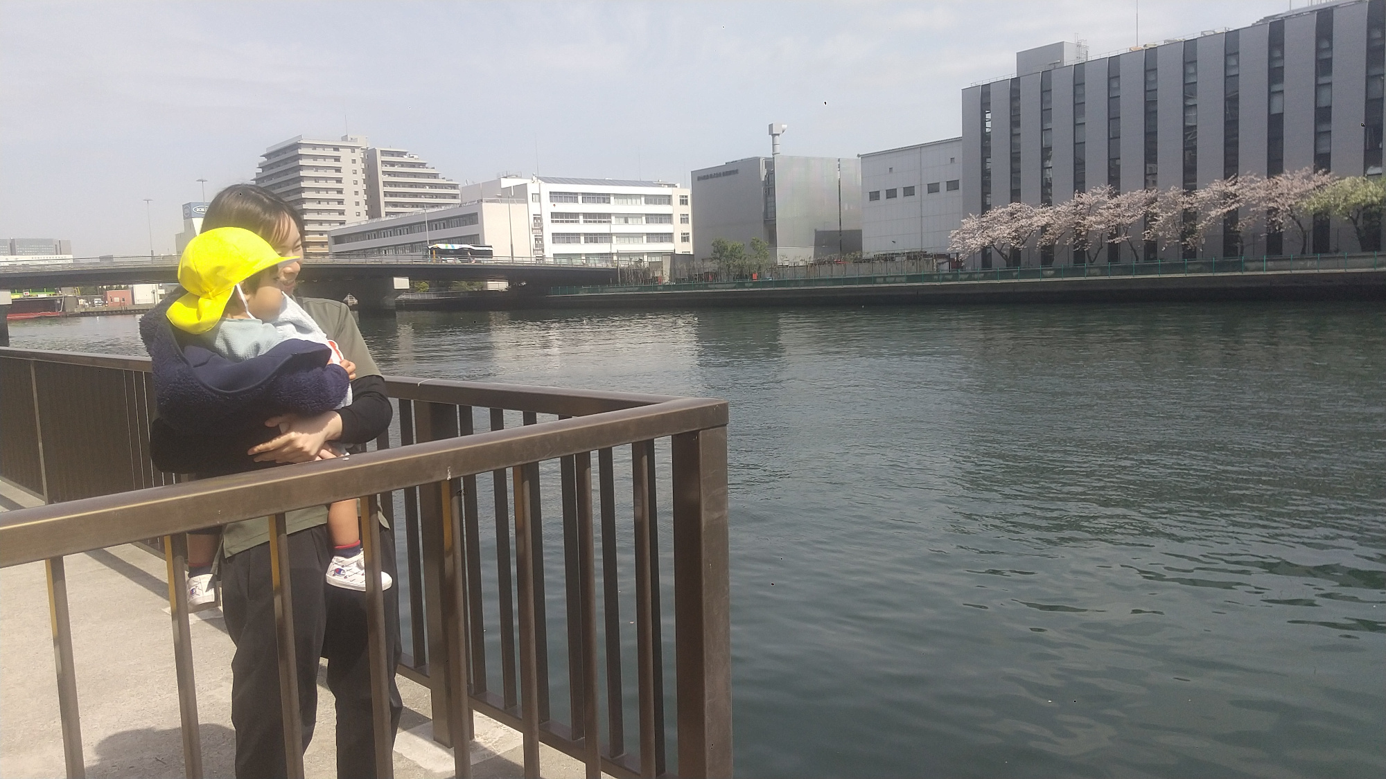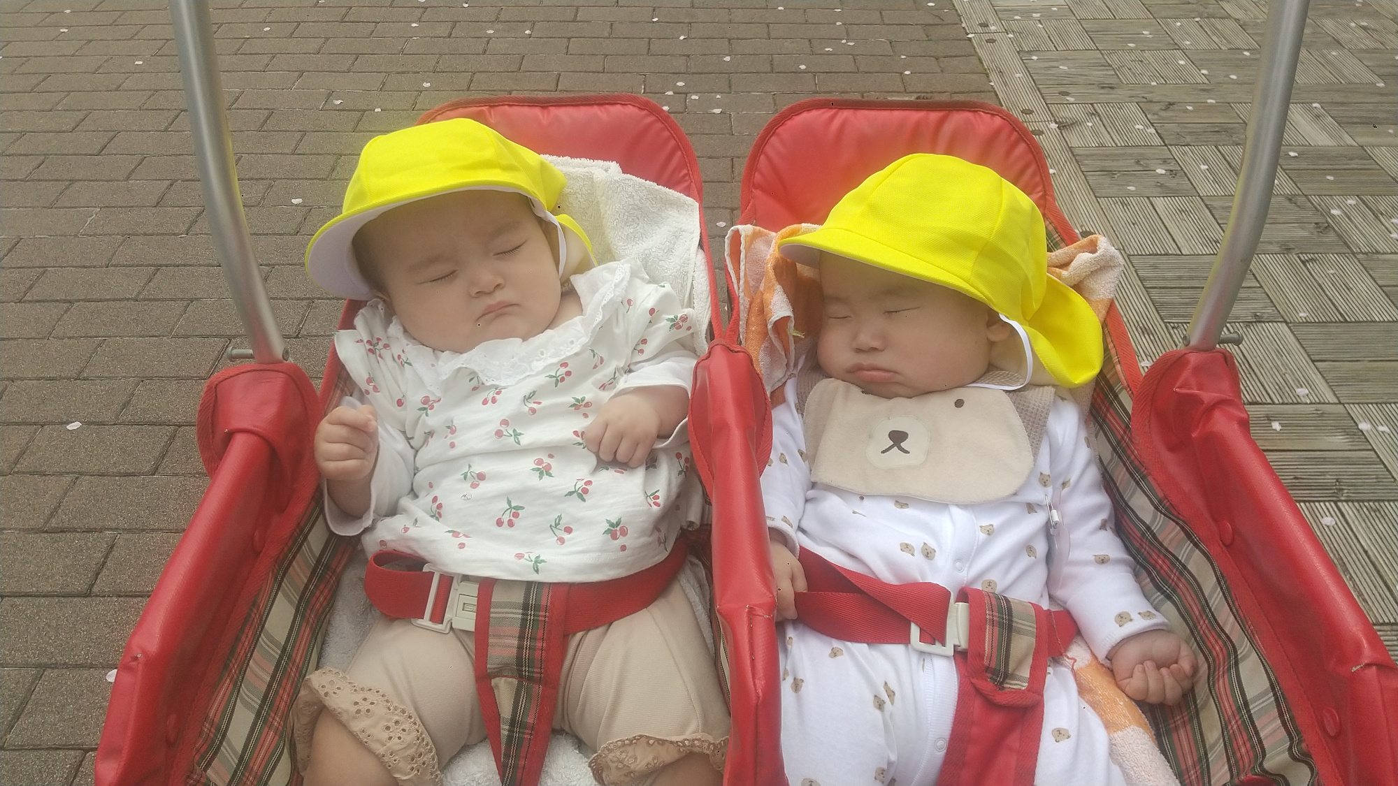 こちらは、桜の花びらが舞う運河沿いを周遊している0歳児です。心地よい春の陽気と風が眠気を誘ってくるのでしょうか。すやすや眠る姿が可愛らしいです。